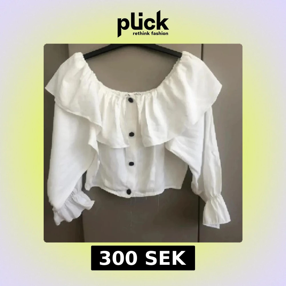 Superfin vit blus med bred volang runt axlarna och svarta knappar framtill. Blusen har långa ärmar med resår vid ärmslut och en luftig, romantisk känsla. Perfekt för dig som gillar en söt och trendig look. Köpte den i Los Angeles