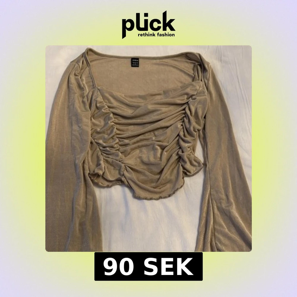 Snygg beige topp från Shein med långa ärmar och rynkade detaljer framtill. Perfekt för en stilren look med en touch av elegans. Toppen har en mjuk och glansig finish.