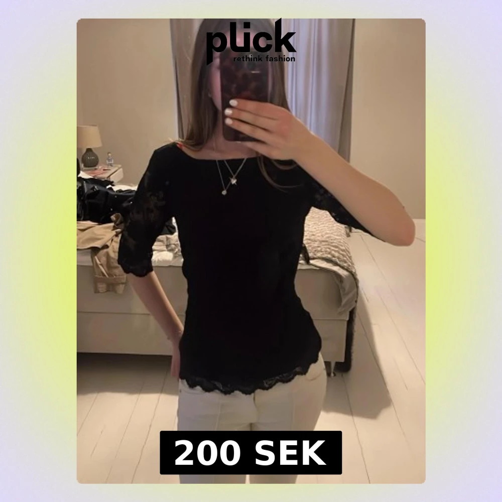 Säljer en svart blus med trekvartsärm och vacker spetsdetalj. Blusen har en feminin form och rund halsringning, samt dekorativ spets längs nederkanten och ärmarna. Perfekt för dig som gillar stilrena och eleganta toppar.