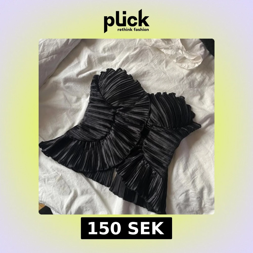 Säljer en svart plisserad tubtopp med volangdetaljer. Toppen är axelbandslös och har en snygg struktur som ger en unik look. Perfekt för dig som vill sticka ut med en trendig och elegant topp.