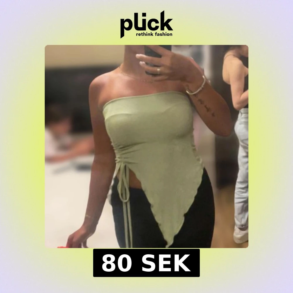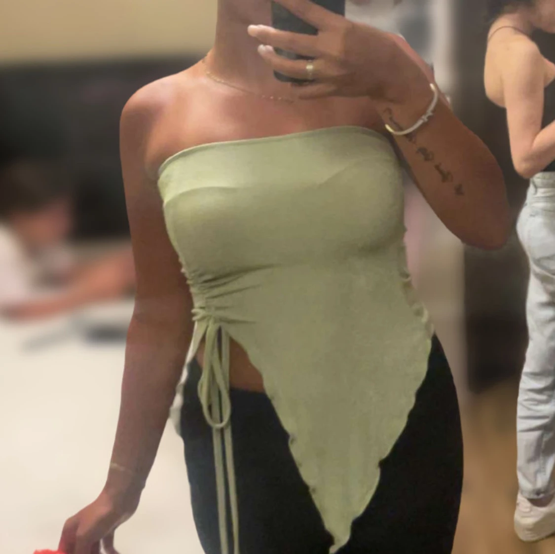 Trendig ljusgrön bandeau tubtopp med asymmetrisk spetsig nederkant och snörning i sidan.