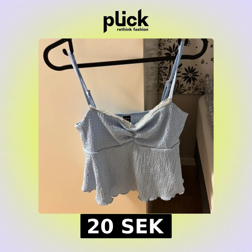 Supersöt ljusblå linnetopp från SHEIN med justerbara smala axelband och v-ringad hals med vit spetskant. Toppen har en rynkad, lätt croppad passform och vågig nederkant. Materialet är mjukt och krinklat, perfekt för sommarens alla dagar.