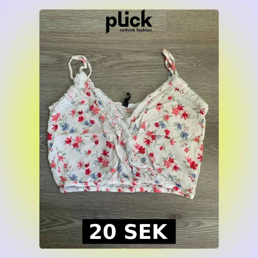Säljer en söt vit linnetopp från Divided i storlek 36 med blommigt mönster i rosa, rött och blått. Toppen har omlott-design, spetsdetaljer och tunna axelband. Perfekt för dig som gillar romantisk och feminin stil.