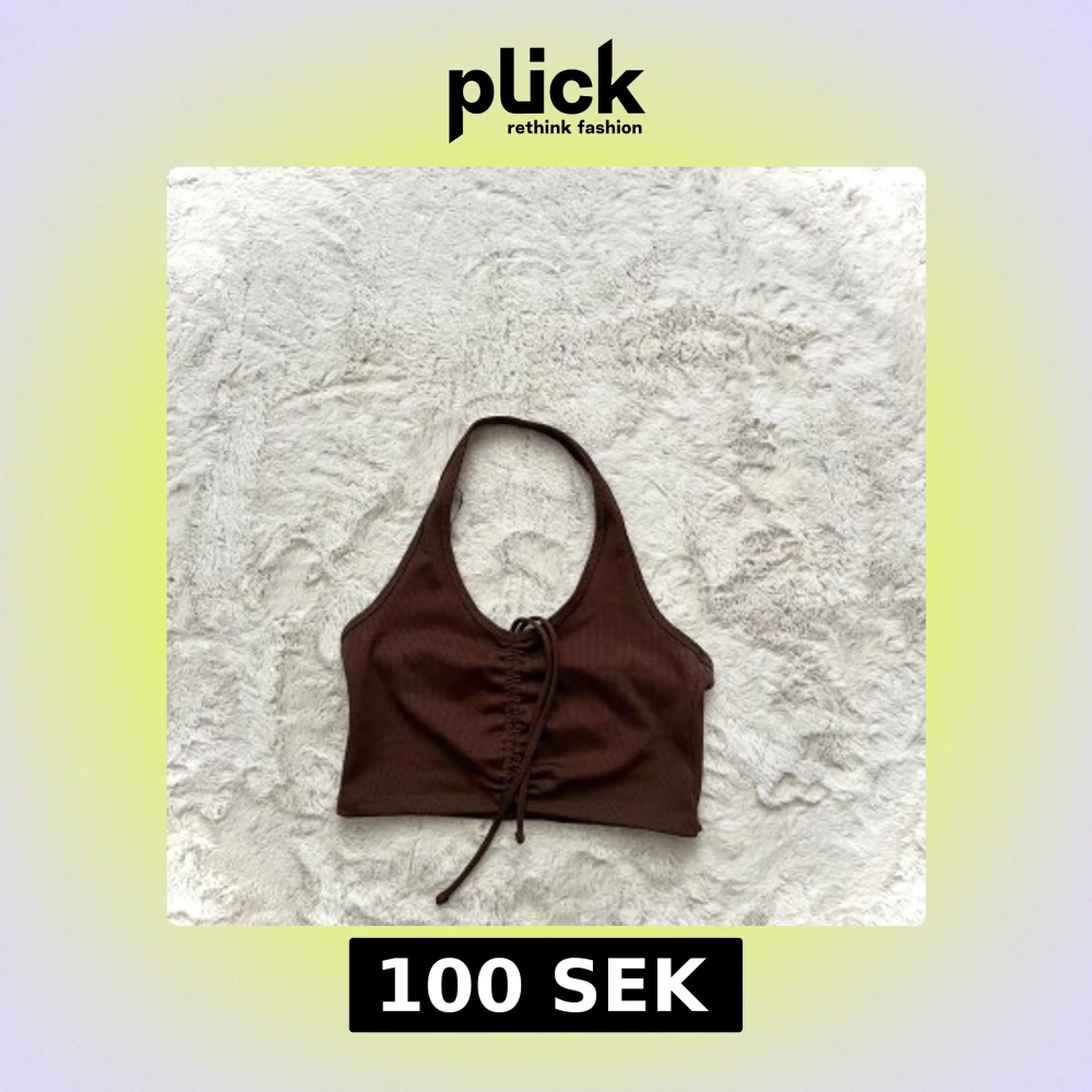 Säljer en snygg brun ribbad halterneck topp med knytning framtill. Perfekt för en trendig look. Passar bra till både jeans och kjol.
