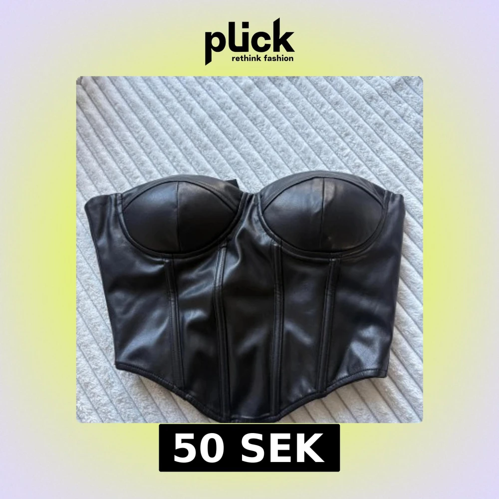 Säljer en svart korsett i skinnimitation med markerade kupor och snygga sömmar som ger en edgy vibe. Toppen är axelbandslös och har dragkedja i sidan för enkel på- och avtagning. Perfekt för att lyfta din outfit med en cool touch.