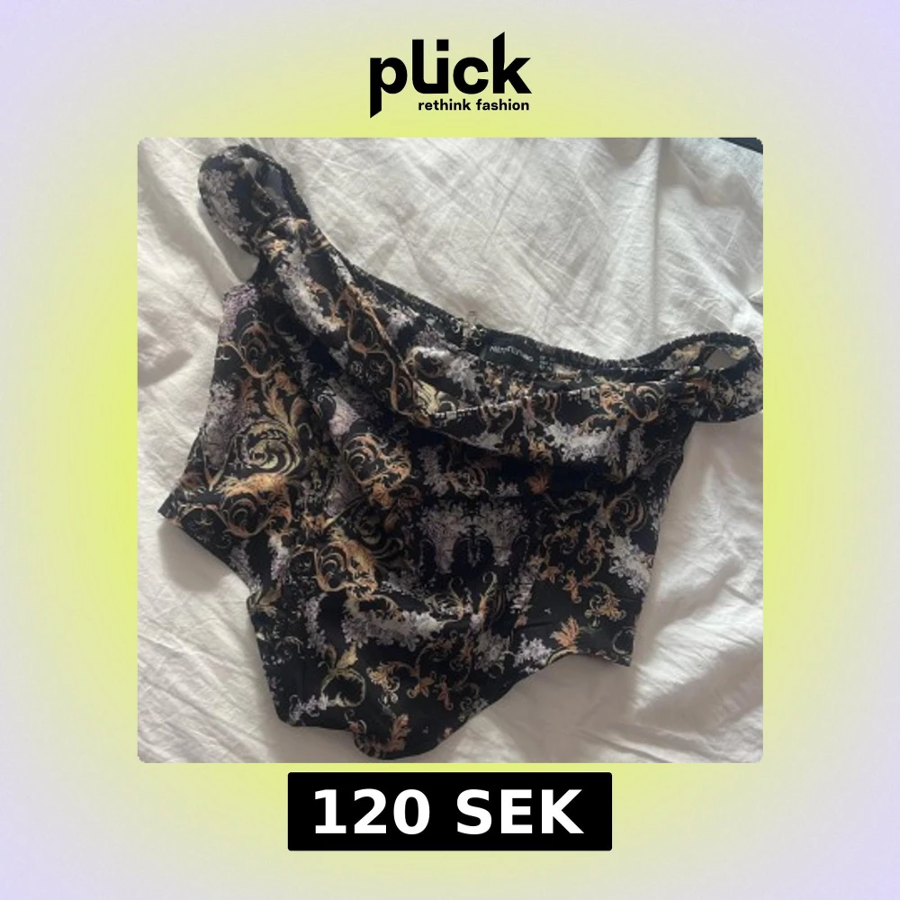 Säljer en svart offshoulder topp från PrettyLittleThing med barockinspirerat mönster i guld och vitt. Toppen har en croppad passform och spetsig nederkant, storlek 36