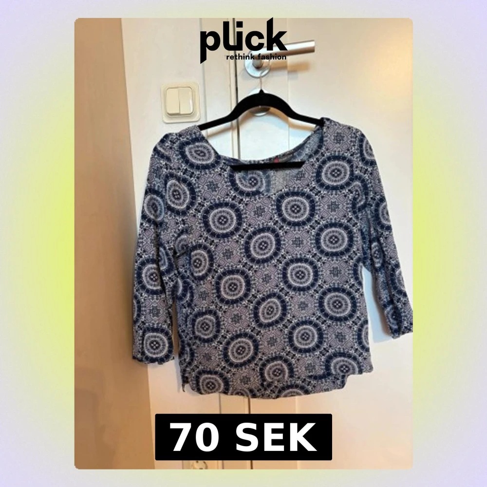 Säljer en blå och vit topp med cirkelmönster.