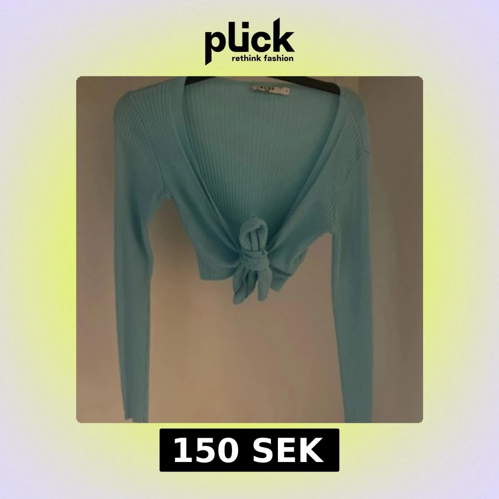 Supersnygg ljusblå croppad topp med lång ärm och knyt framtill. Toppen är ribbad och har en djup v-ringning.