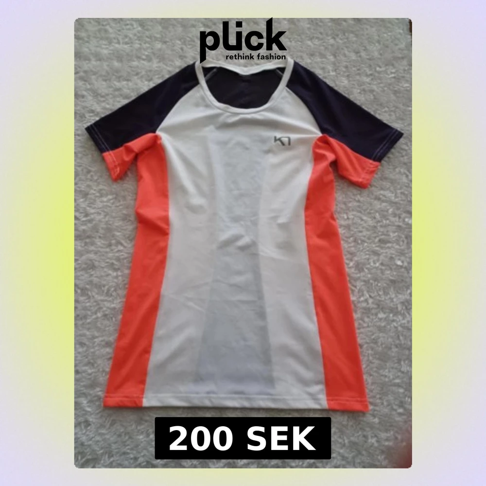 Snygg och sportig topp från Kari Traa i vitt, lila och orange. T-shirten har korta ärmar, rund halsringning och ett stilrent tryckt logotyp på bröstet. Tillverkad i ett mjukt och stretchigt syntetmaterial som passar perfekt till träning. Etiketter bortklippta då jag alltid tar bort när jag får hem nytt. Nyskick.
