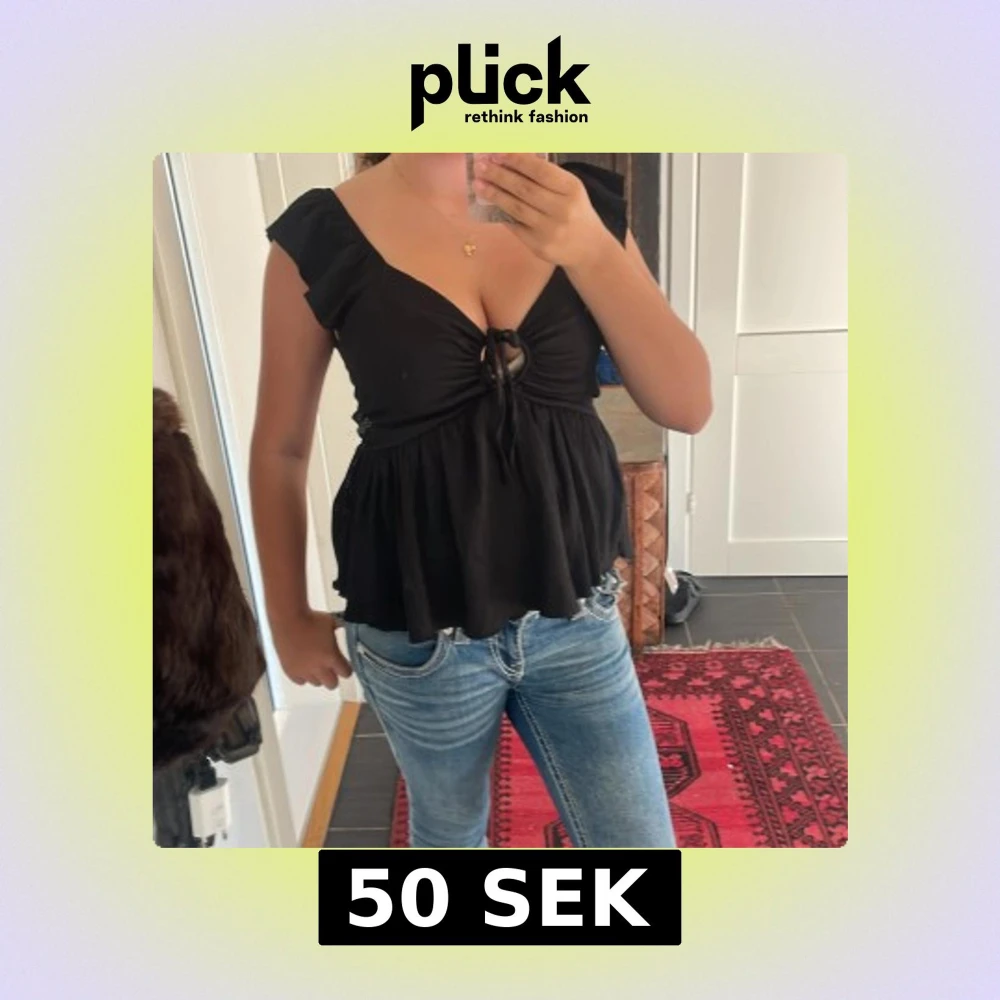 Supersöt svart blus med djup v-ringning och knyt framtill. Toppen har volangiga ärmar och en flowy, luftig passform nedtill. Perfekt för dig som gillar en feminin och trendig look. Materialet känns lätt och svalt, perfekt för varma dagar.