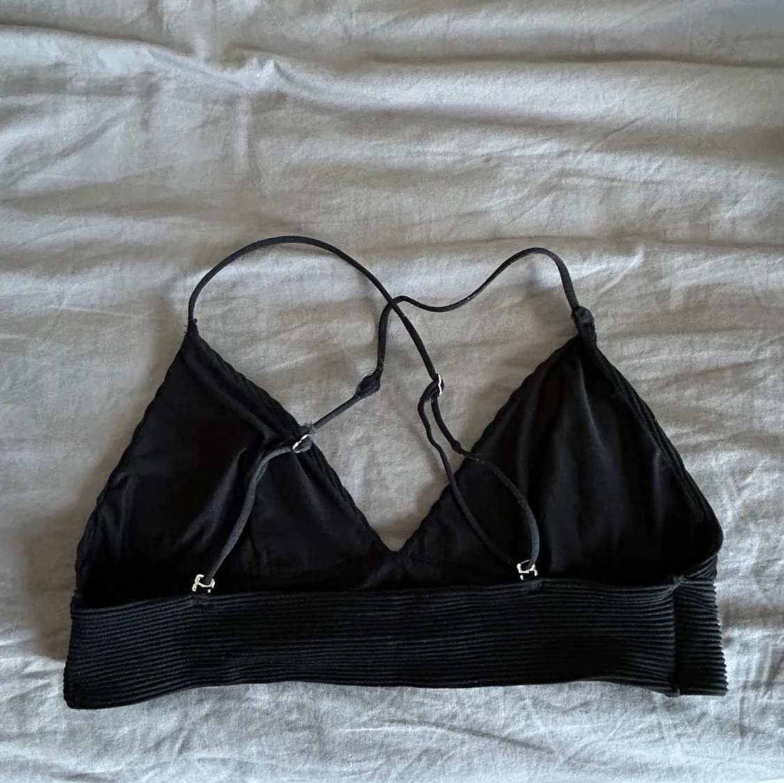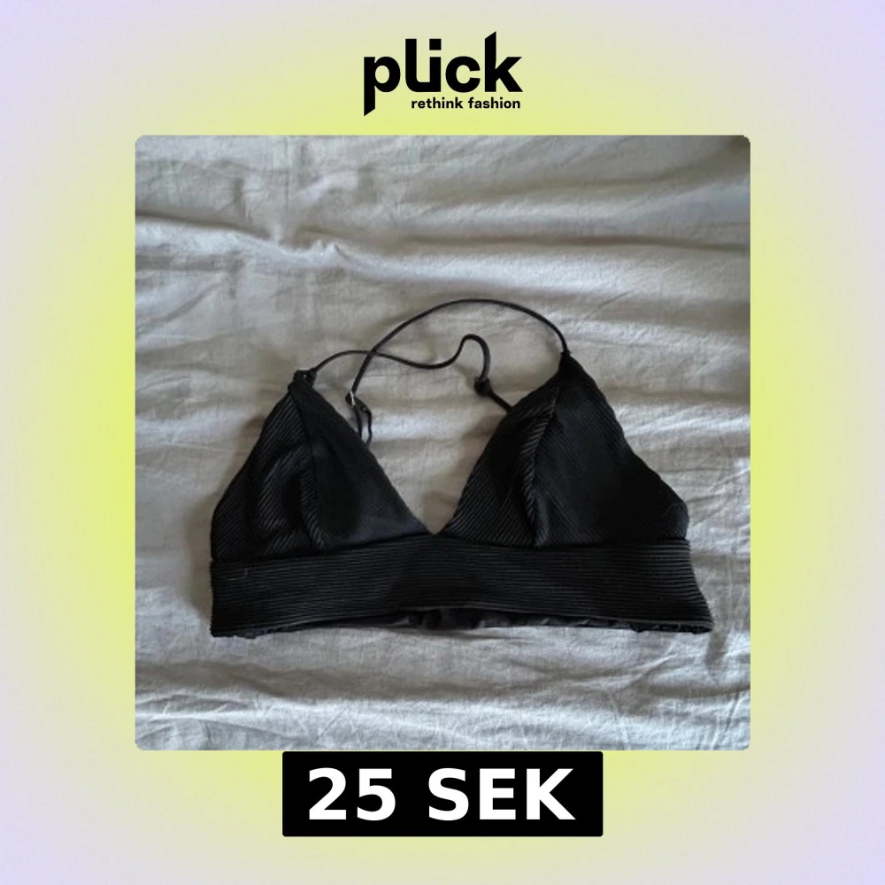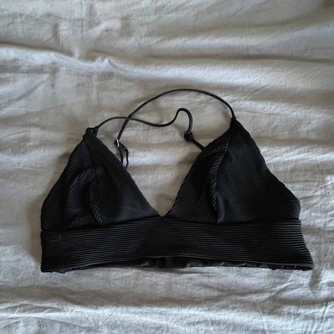 Säljer svart bikinitopp i riggat mtrrial från hm. Den har justerbara axelband som korsas i ryggen.
