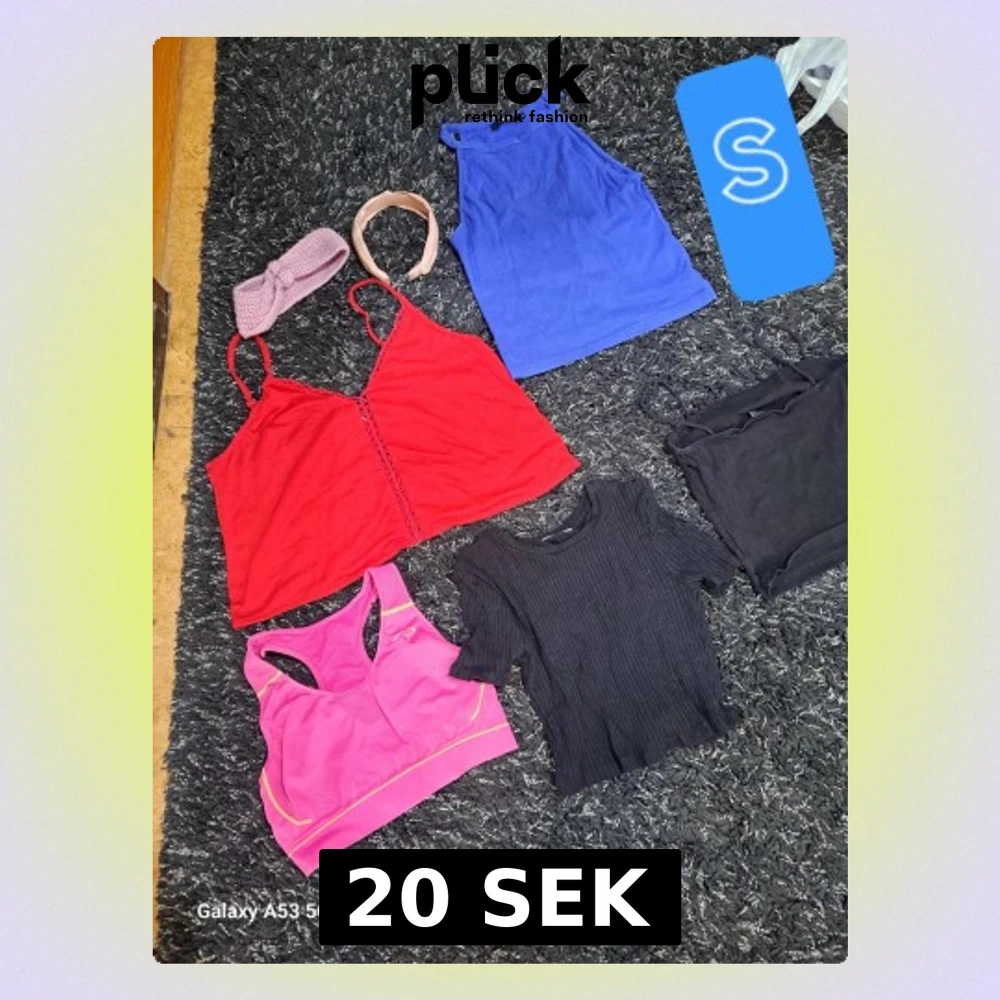 Säljer ett paket med fem olika toppar: en röd linnetopp med tunna axelband, en blå ärmlös topp med hög hals, en svart ribbad kortärmad topp, en rosa sportig topp med gula detaljer och en svart enkel topp. Perfekt för dig som vill variera din stil!