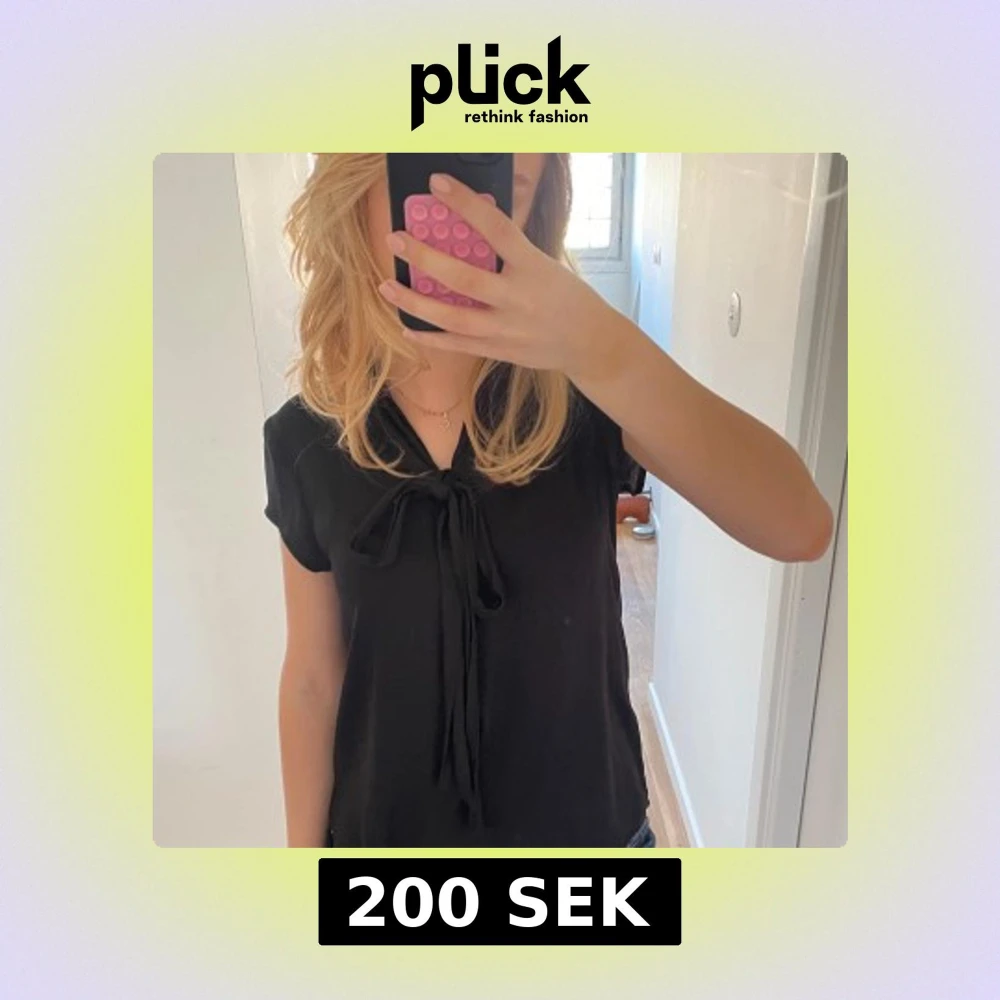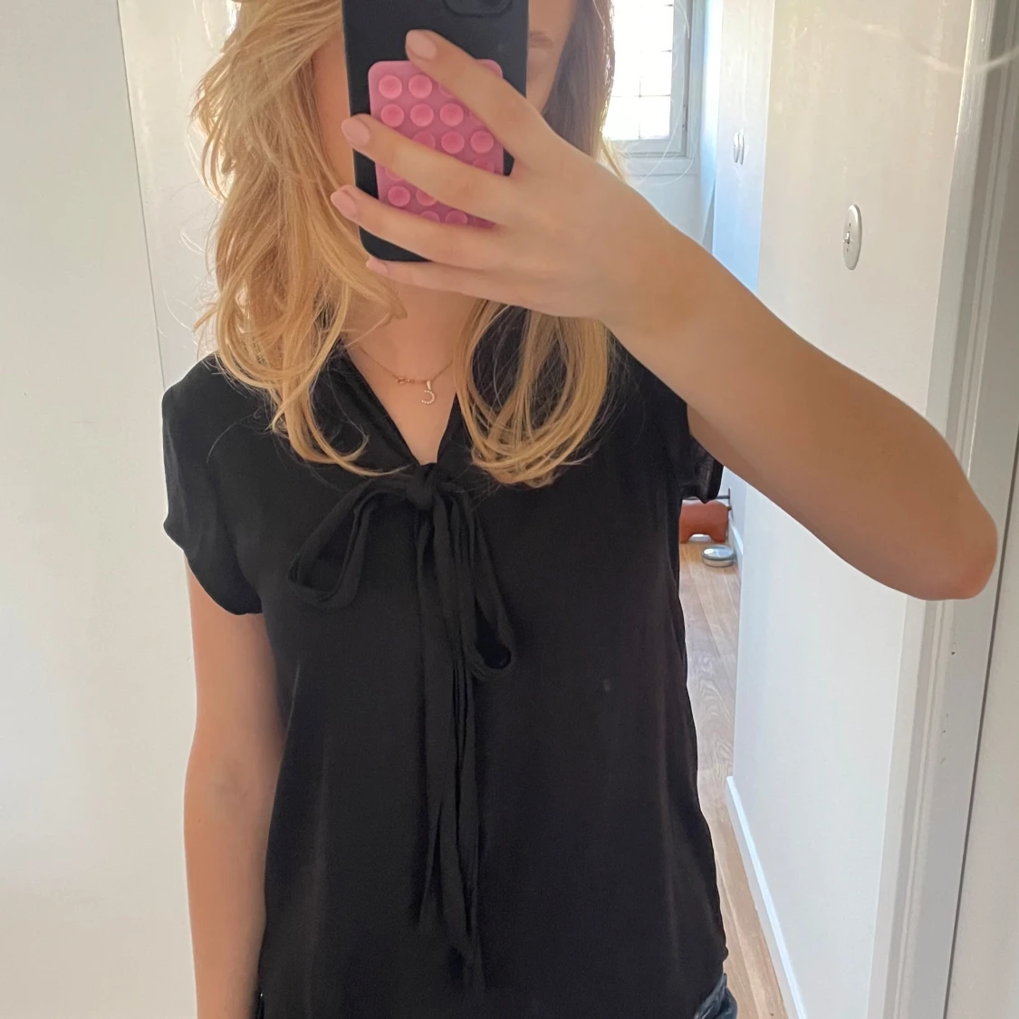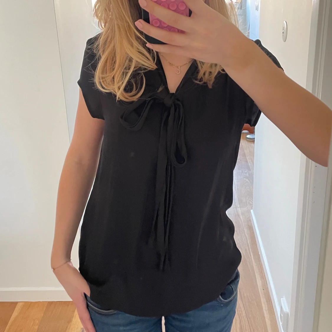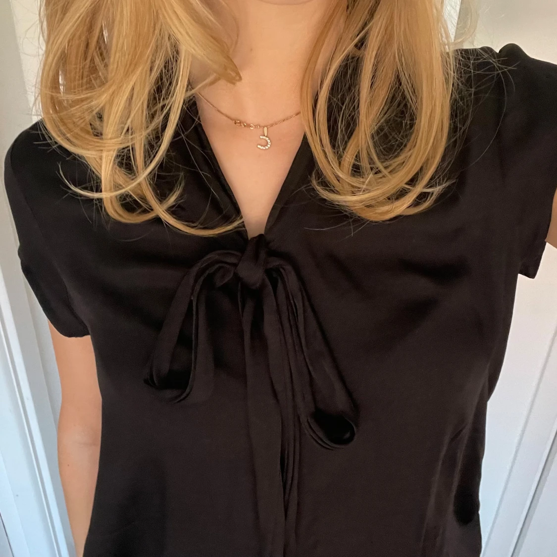 Snygg svart siden blus med korta ärmar och ett knytband vid halsen.