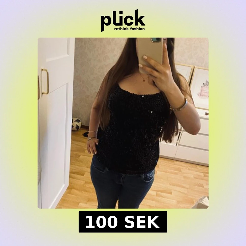 Säljer ett svart linne täckt av glittriga paljetter, perfekt för dig som vill sticka ut. Linnet har smala axelband. Materialet är syntet och toppen är helsvart med en glittrig yta som fångar ljuset snyggt. 💕