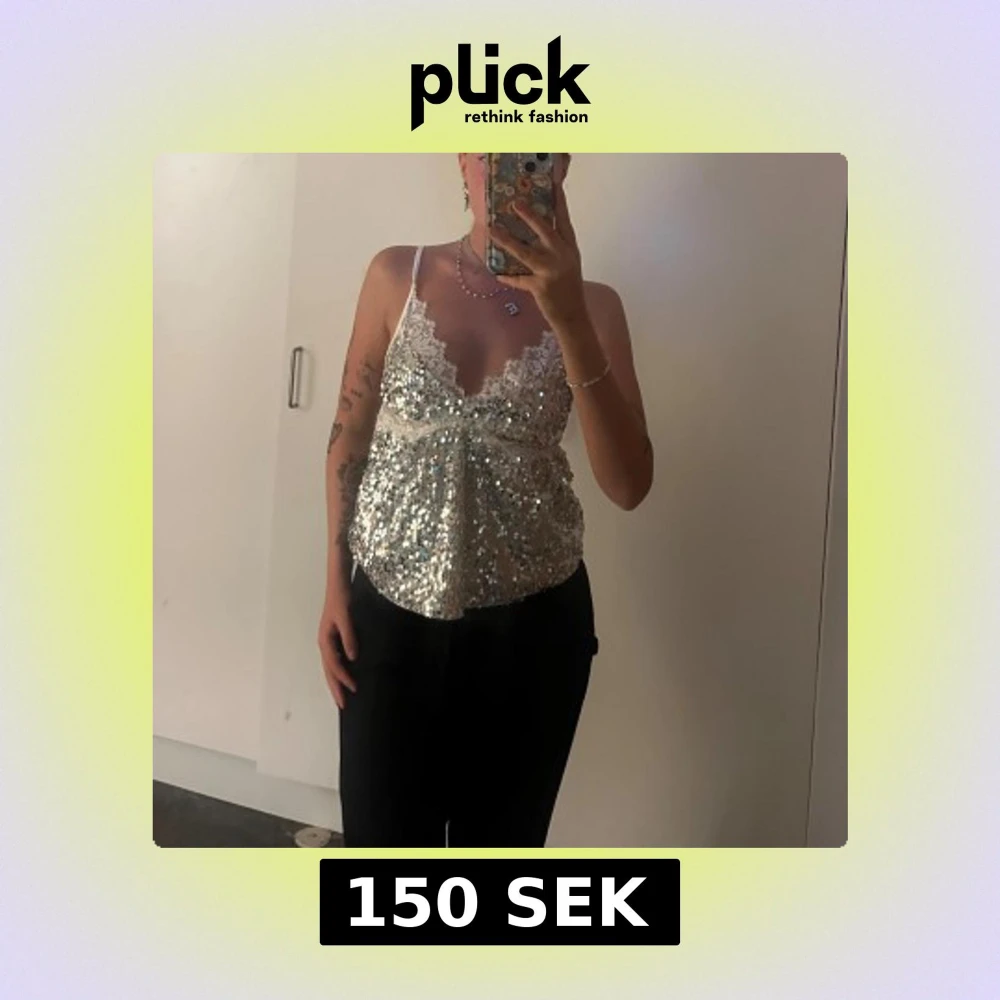 Supersnygg glittrig linne-topp i silver med tunna axelband och v-ringning. Toppen har spetsdetaljer upptill och är täckt av paljetter. Helt oanvänd :)