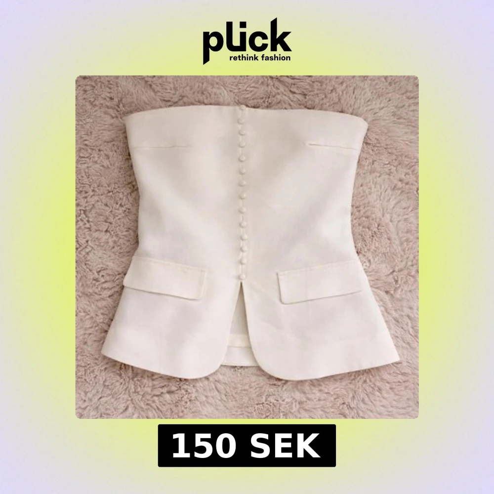 Säljer en elegant vit tube-topp med dekorativa klädda knappar framtill och två fickdetaljer. Toppen är axelbandslös och har en liten slits framtill för extra stil. Användt 1 gång.