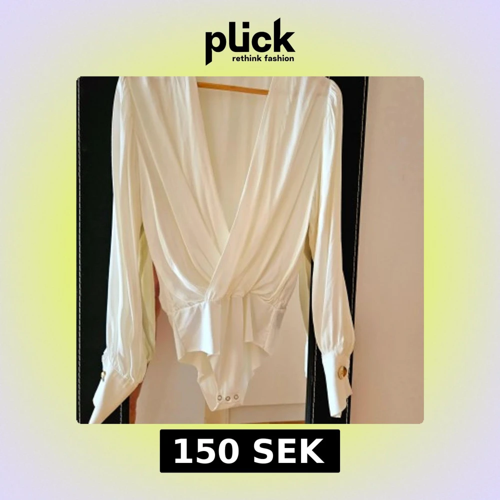 Säljer en elegant vit bodysuit med djup omlott-ringning och långa ärmar. Bodyn har breda manschetter med guldknappar och knäppning i grenen. Perfekt för en stilren look.