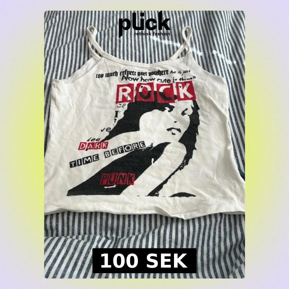 Säljer ett vitt croppat linne med tunna axelband och ett stort svart och rött rock/punk-tryck framtill. Trycket har text och en grafisk bild av ett ansikte. Perfekt för dig som gillar edgy och unik stil. Y2K
