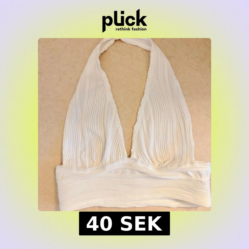 Vit tubtopp med halterneck och djup v-ringning. Toppen har ett ribbat, veckat tyg. Köpt från Shein. Storlek: 38