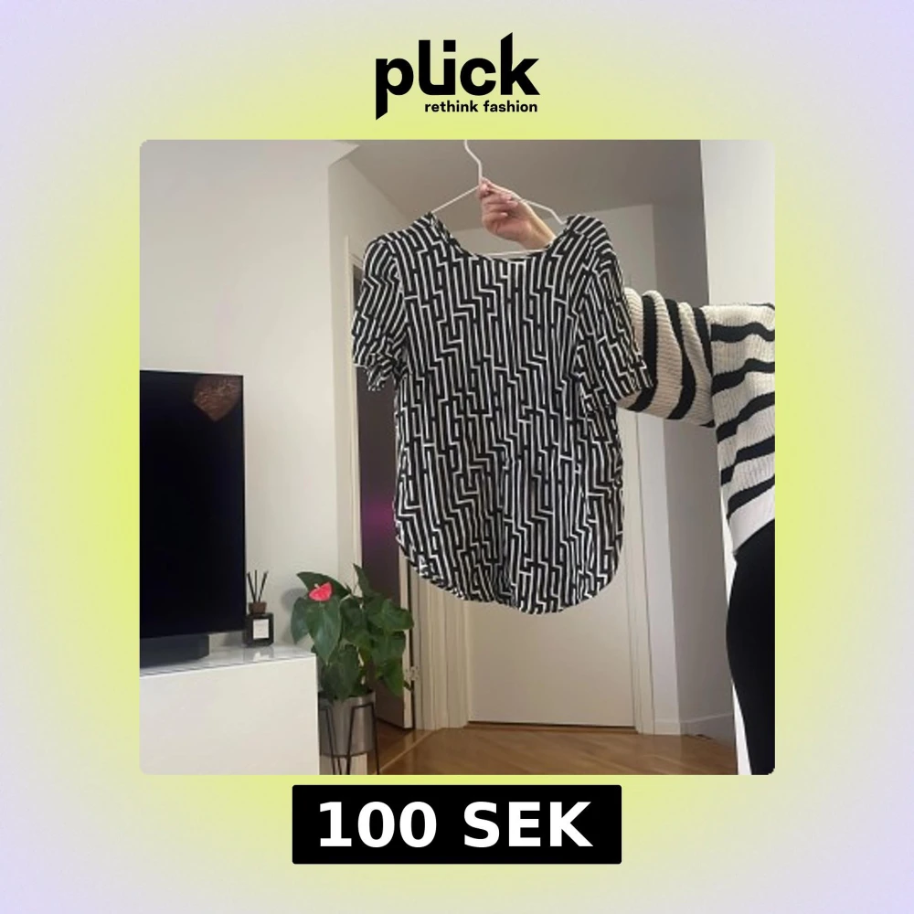 Säljer en svartvit blus med grafiskt mönster och rund hals. Toppen har korta ärmar och en lös passform, perfekt för dig som gillar en stilren men ändå cool look. Passar till både jeans och kjol för en trendig outfit.