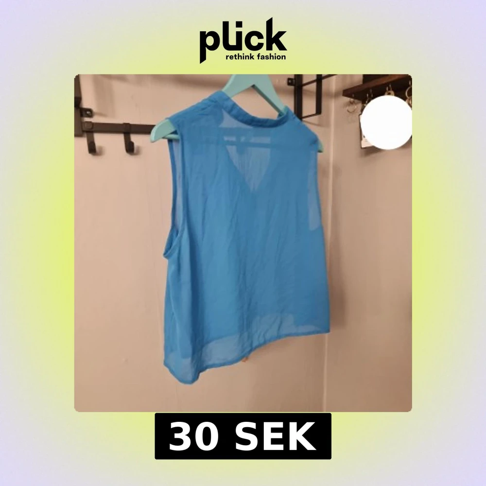 Säljer en blå ärmlös blus i tunn och luftig polyester. Blusen har v-ringning och är croppad, perfekt för varma dagar. Enkel och stilren design som passar till mycket.