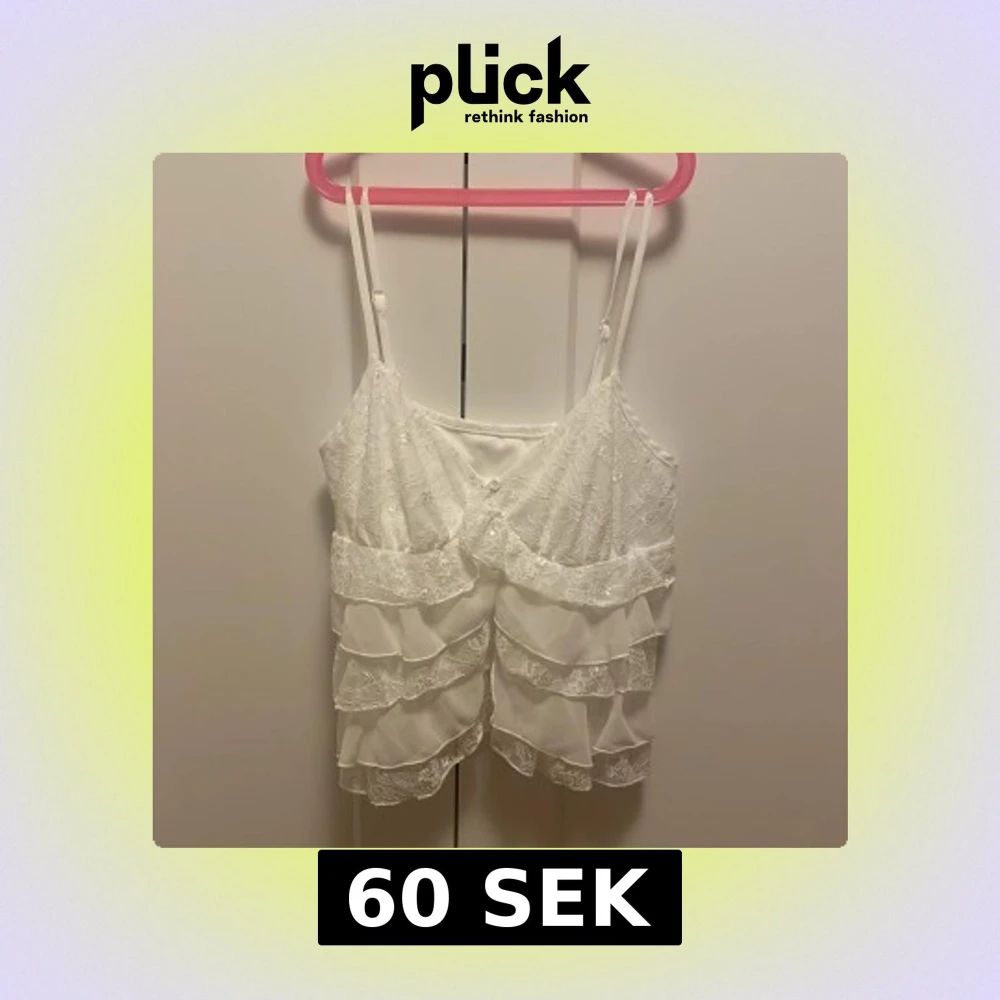 Söt vit linne med justerbara axelband och vackra spetsdetaljer. Toppen har flera lager av volanger som ger en romantisk känsla. Perfekt för varma sommardagar eller som ett lager under en kavaj. Den har även en öppning med två knappar överst som synligt på bilden.