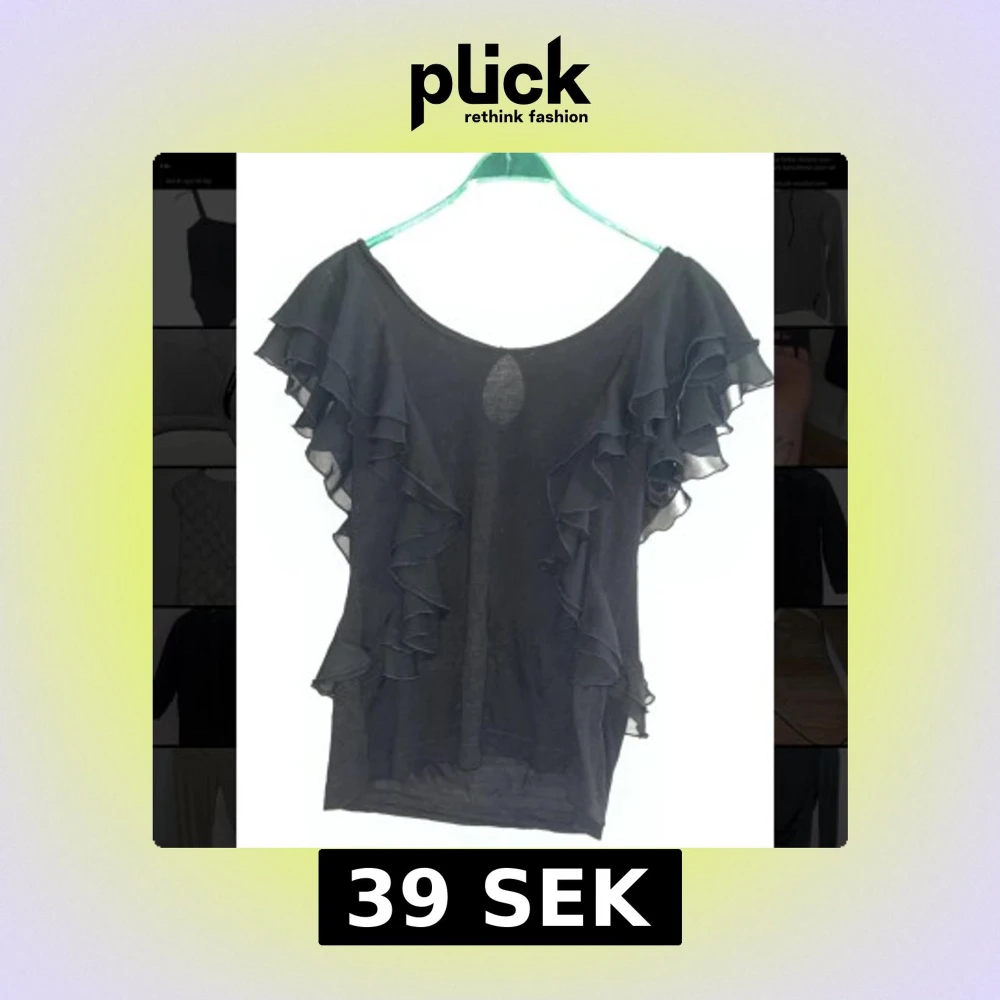 Säljer en svart topp med volangdetaljer längs ärmarna och axlarna. Toppen har en vid urringning och är tillverkad i ett lätt material som faller snyggt. Perfekt för dig som gillar romantiska detaljer.