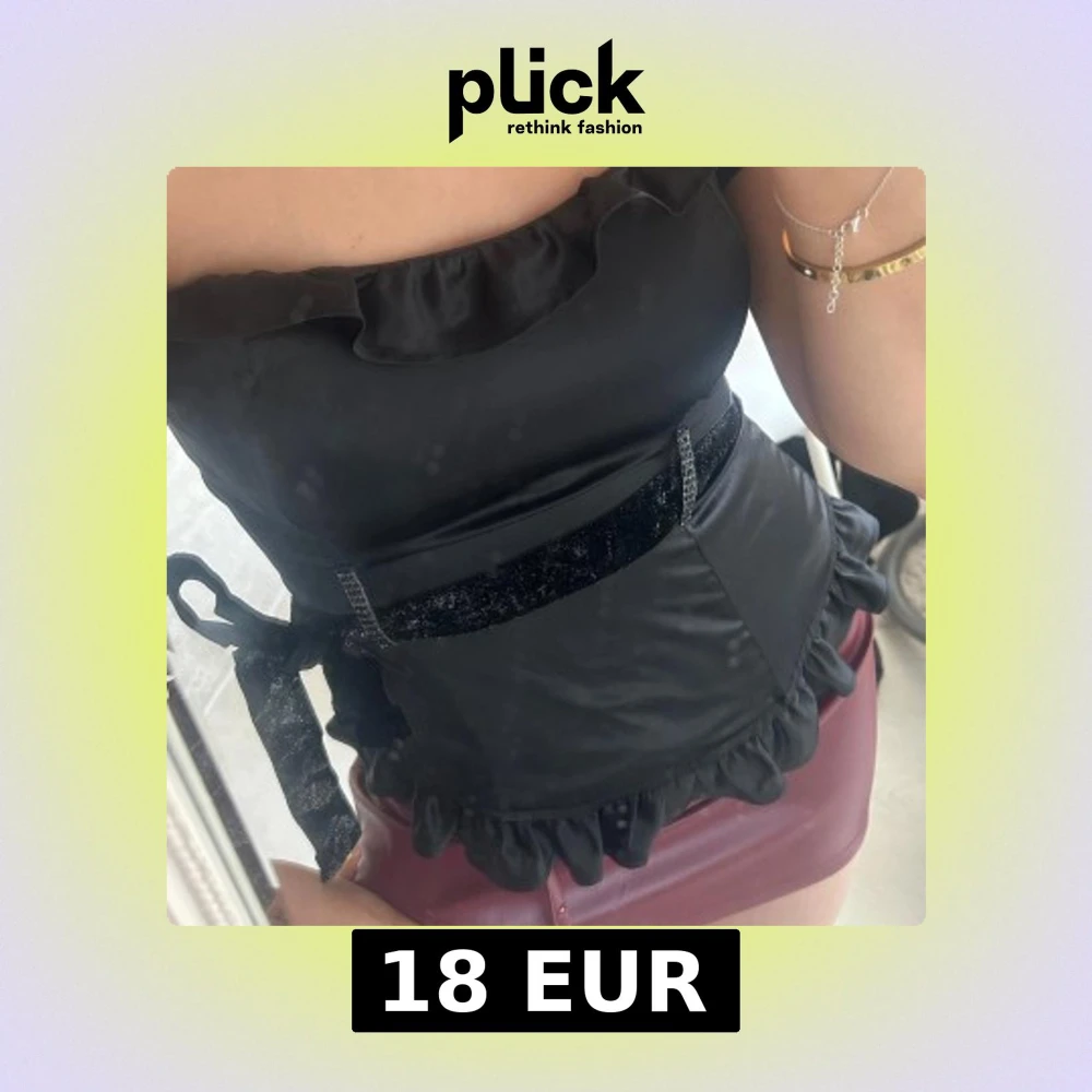 Snygg svart axelbandslös topp med volangdetaljer och glittrigt knytband i midjan. Toppen har en elegant design med en figurnära passform och är perfekt för en kväll ute. Materialet ger en lyxig känsla och volangerna ger en extra touch av stil.