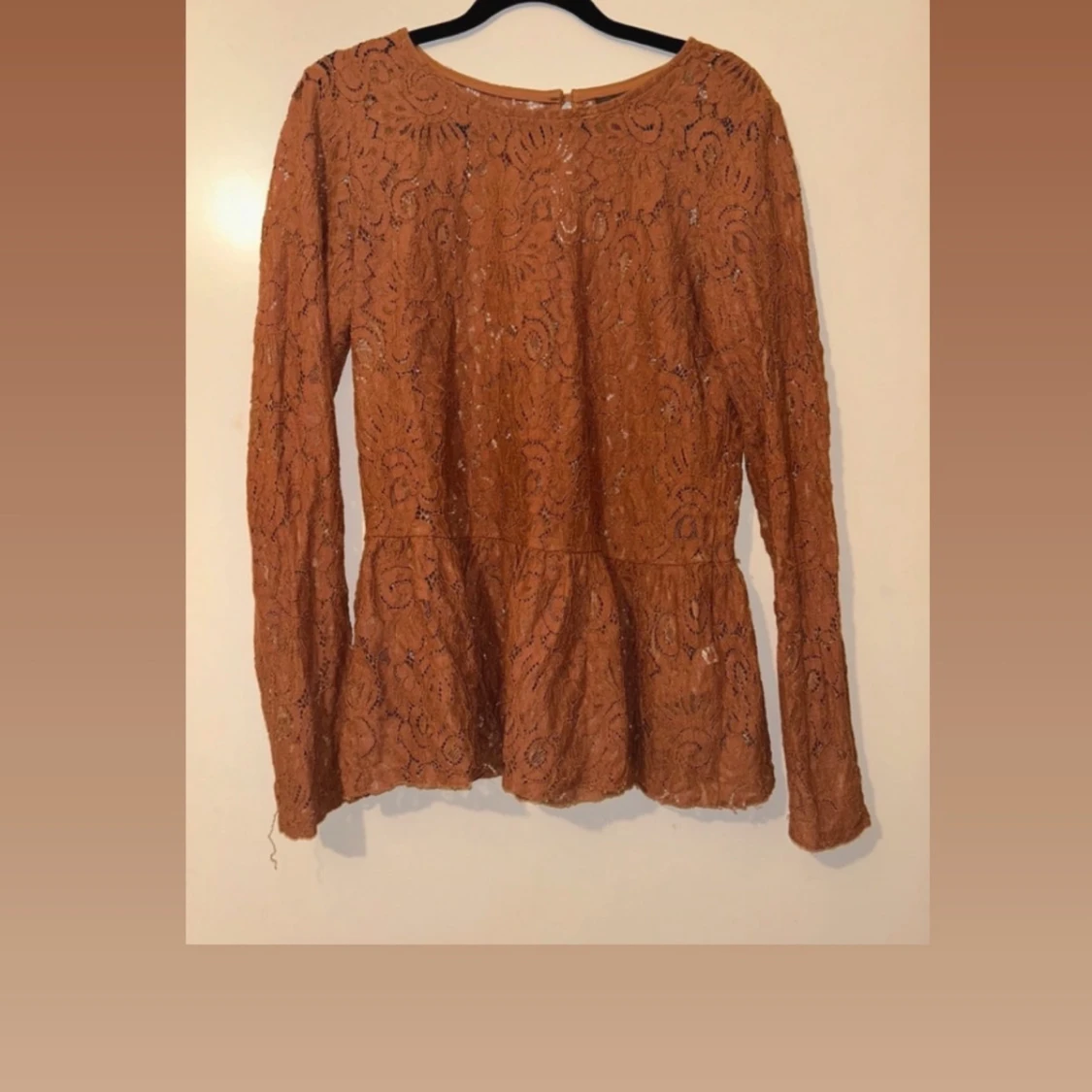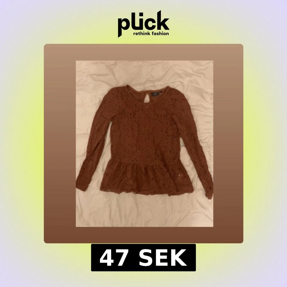 Säljer en brun långärmad blus i spets med snygg volang nertill. Blusen har rund halsringning och ett litet knappslå bak i nacken. Perfekt för dig som gillar romantiska detaljer och vill sticka ut lite extra.