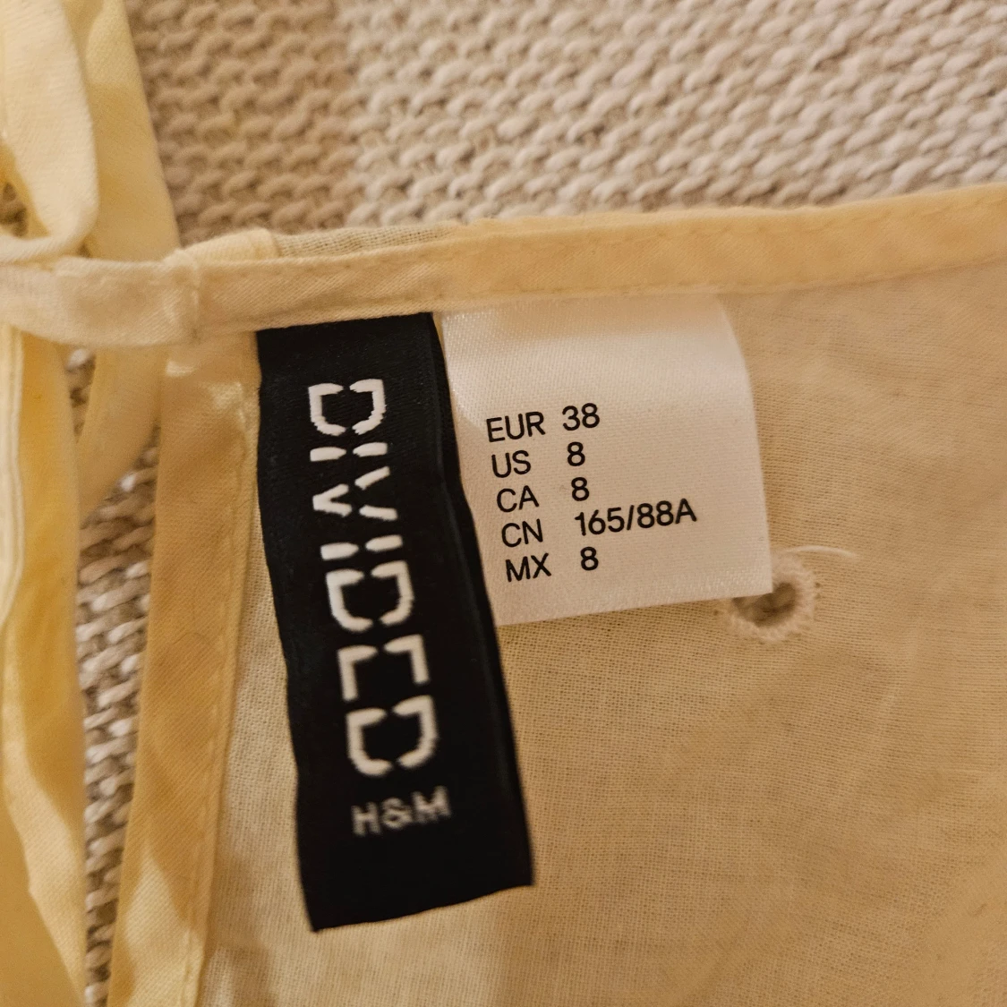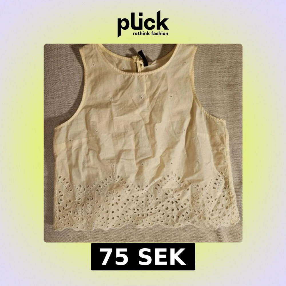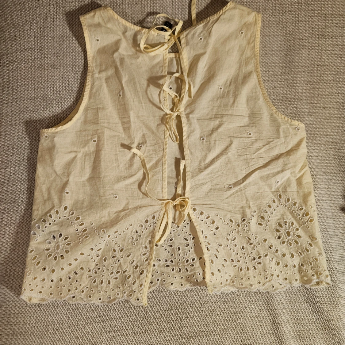 Säljer en söt gul ärmlös topp från H&M. Divided i storlek 38 med broderade detaljer och knytning i ryggen. Toppen har ett vackert hålmönster längs nederkanten som ger en romantisk touch.