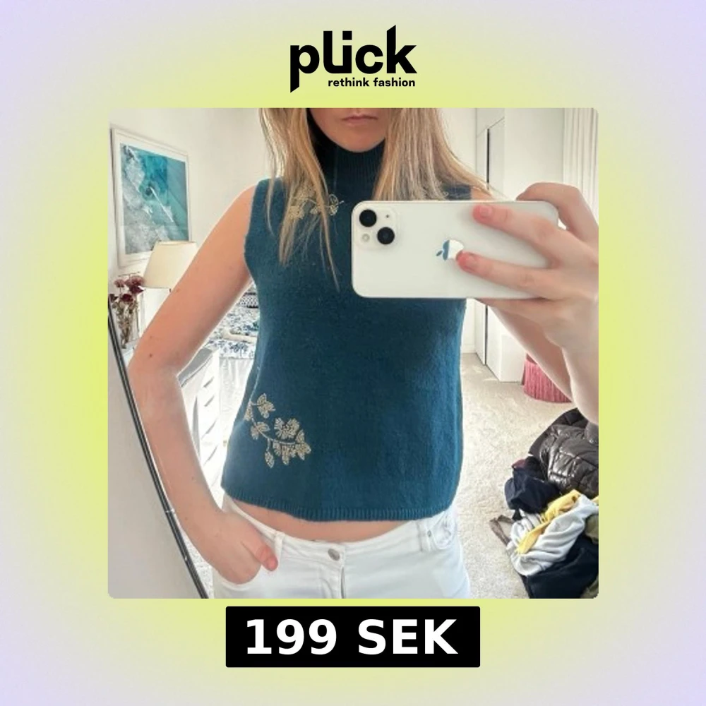 Mysig blå stickad topp med hög hals och ärmlös design. Toppen har fina broderade blommor i vitt och gult på ena axeln och vid sidan. Perfekt att styla med jeans eller kjol för en trendig look. Från Zara passar M!