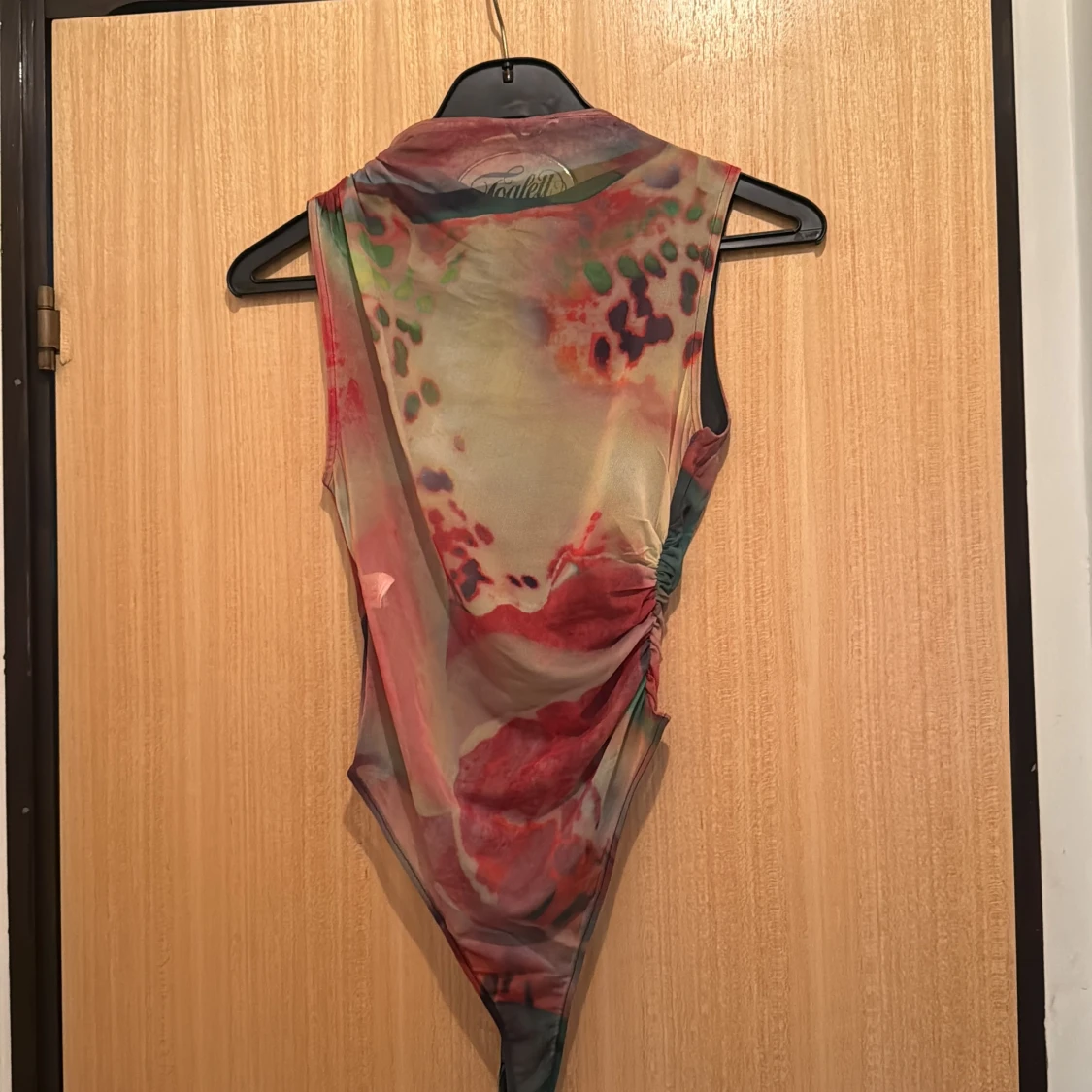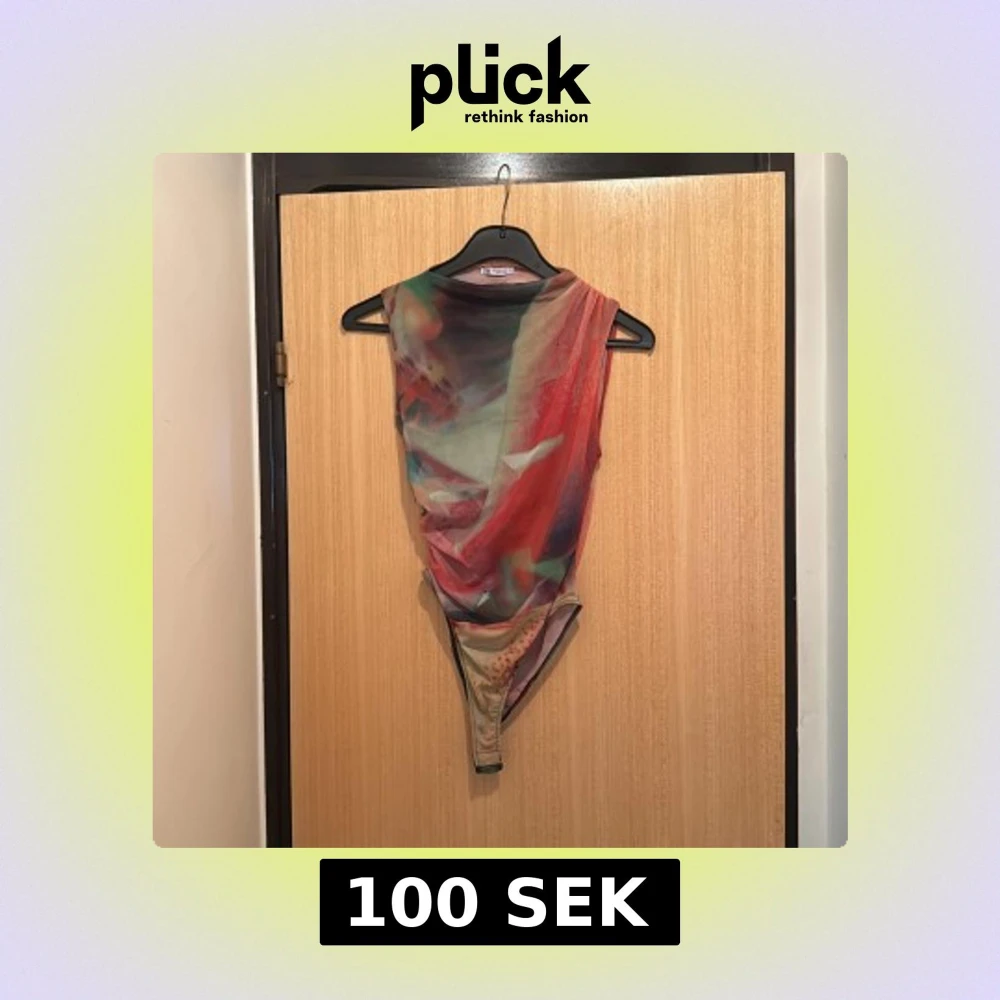 Säljer en ärmlös mesh bodysuit från Gallito med abstrakt mönster i rött, grönt, beige och inslag av lila. Toppen har en tight passform och är tillverkad i tunn, stretchig polyester. Perfekt för dig som vill sticka ut med coola färger och unik design.
