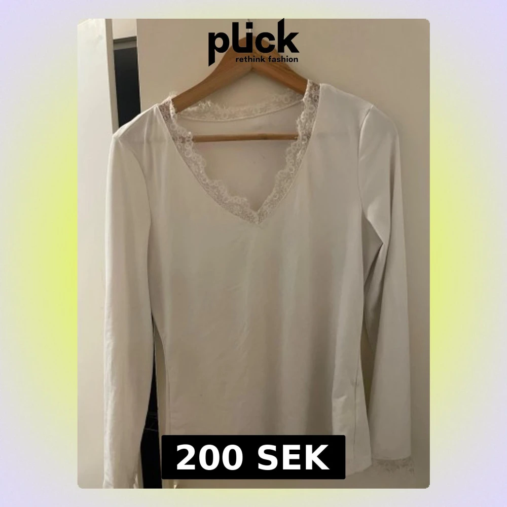 Vit långärmad topp med v-ringning och fina spetsdetaljer runt halsen och ärmsluten. Enkel och stilren design som passar perfekt till jeans eller kjol. Mjuk och skön, perfekt för dig som gillar en clean look.