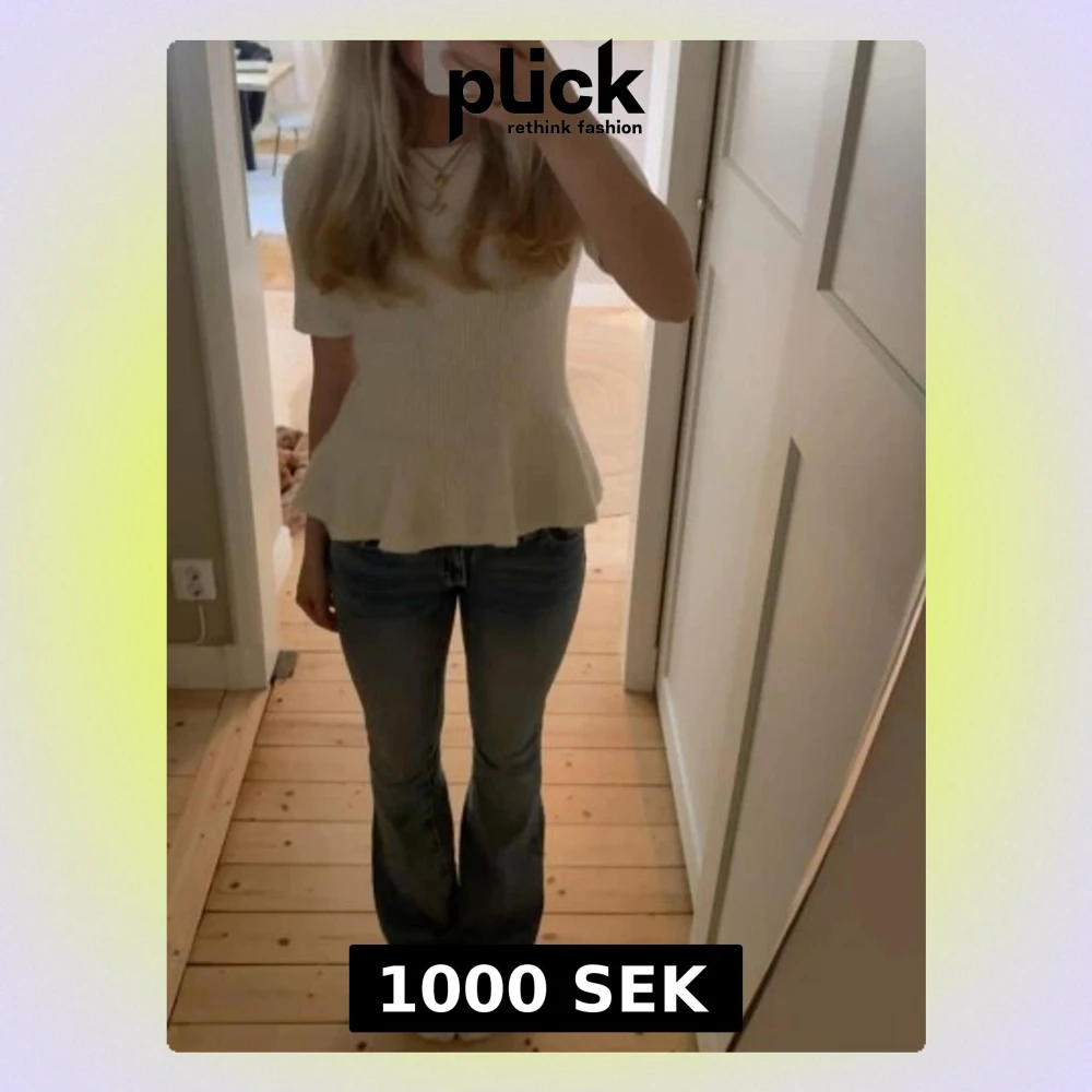 Säljer en söt vit topp med ribbad struktur och volang nedtill. Toppen har korta ärmar och en figurnära passform upptill som släpper ut i en peplumvolang. Perfekt att styla med jeans eller kjol.