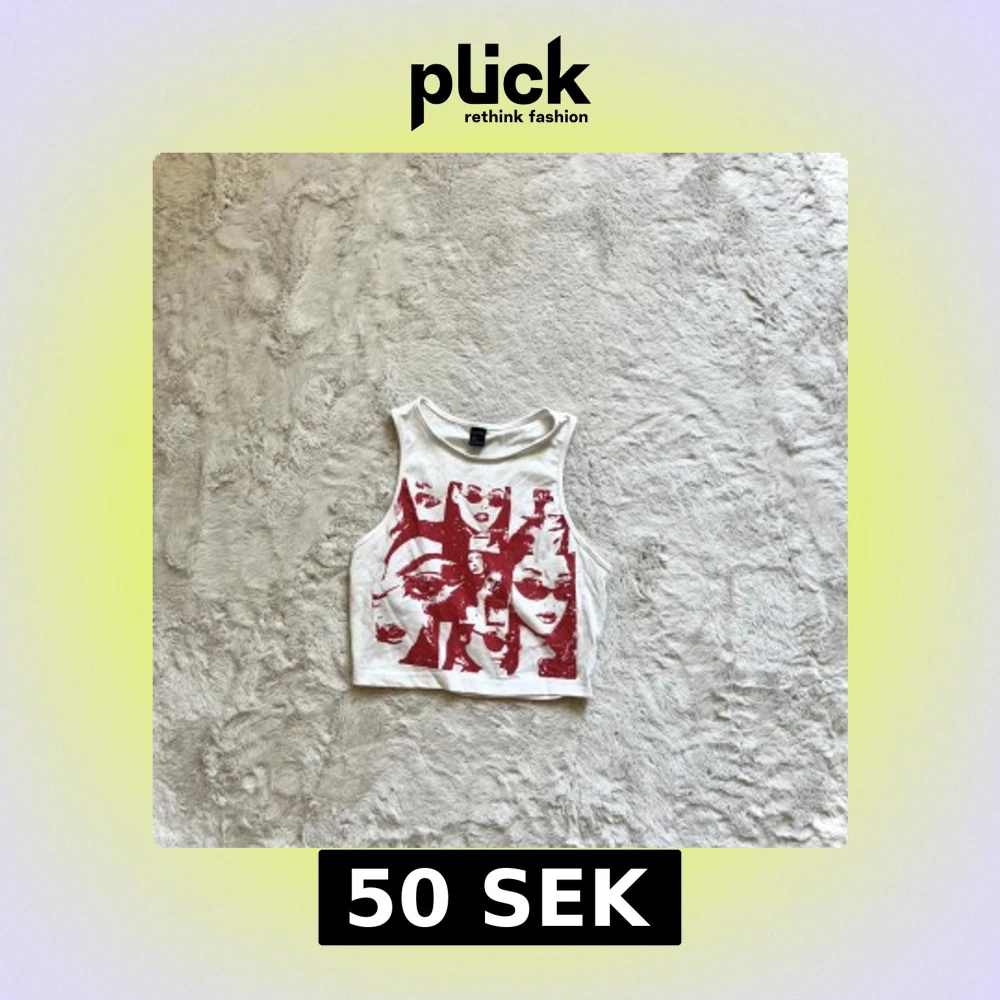 Säljer en vit croppad linnetopp med ett coolt rött tryck av ansikten. Perfekt för en avslappnad stil. Toppen är ärmlös och har en rund halsringning.