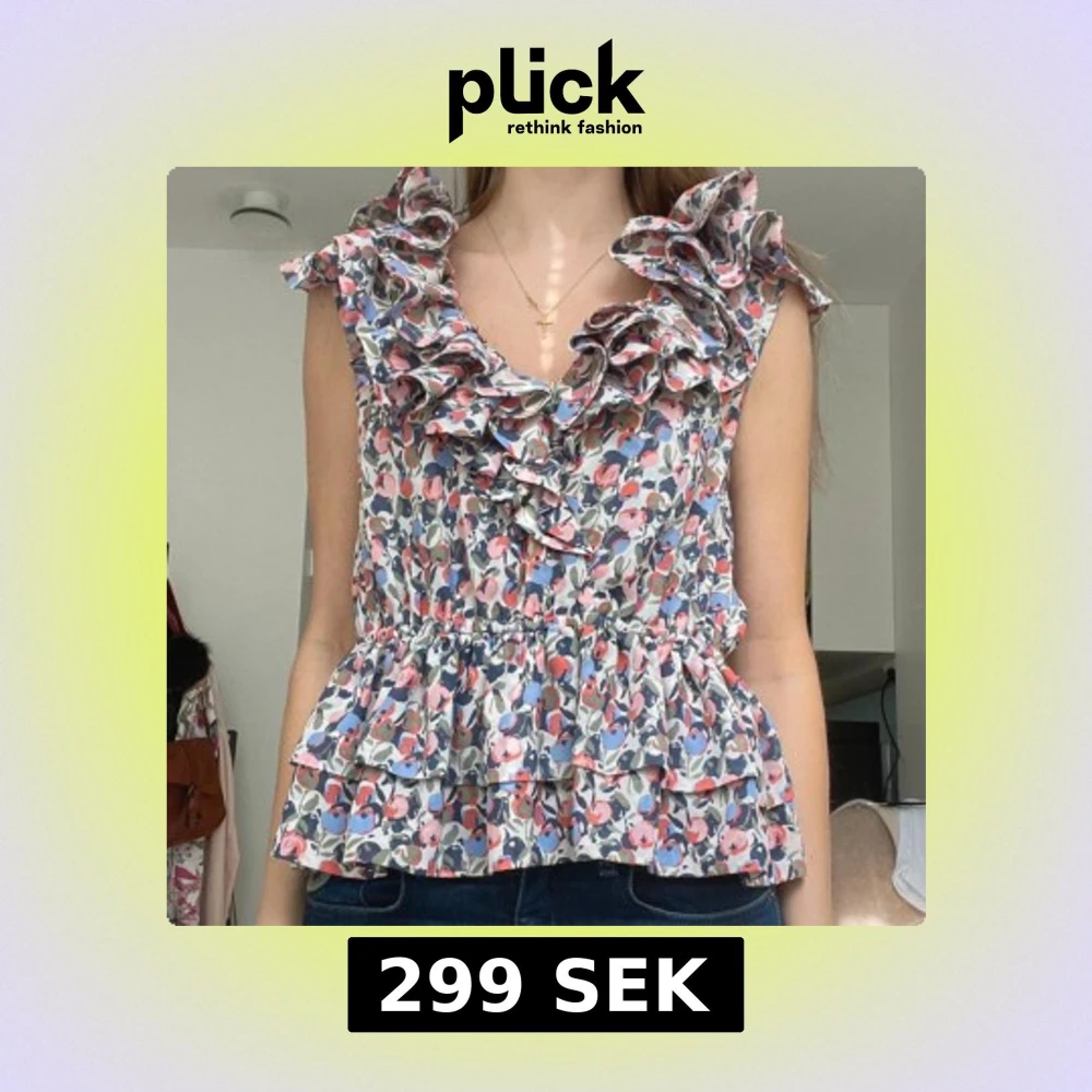 Supersöt blommig blus med volanger längs v-ringningen och axlarna. Färgerna går i rosa, blått, rött och grönt på ljus botten. Blusen är ärmlös och har markerad midja med volangkant nertill. Perfekt för dig som gillar romantisk och lekfull stil.