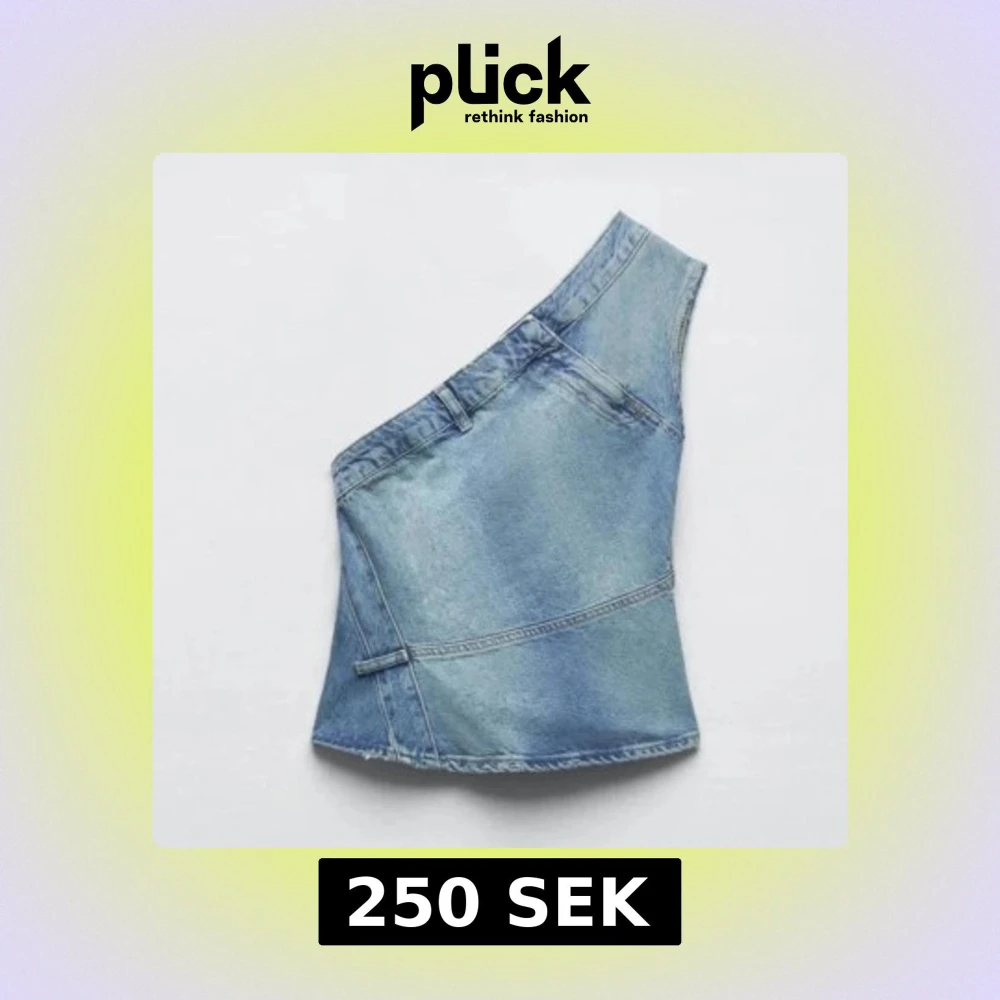 Cool jeans top i blå denim med asymmetrisk axel😍