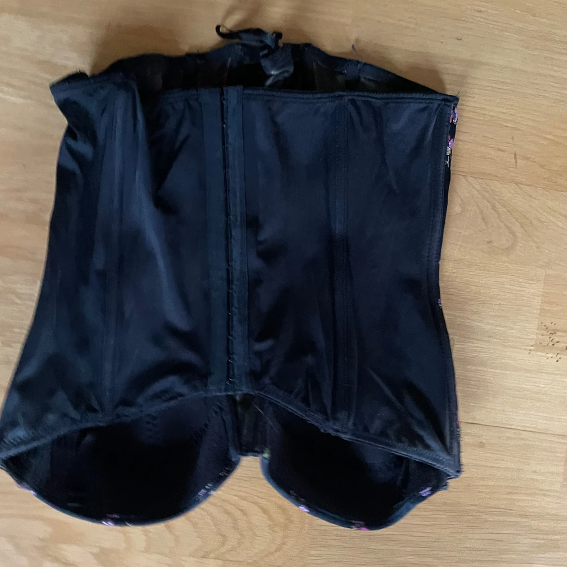Elegant svart korsett med blommigt mönster i lila, rosa och grönt. Tillverkad i ett glansigt material med snörning bak för justerbar passform. Perfekt för att ge en stilfull touch till din outfit. Passar om du har stora bröst!!