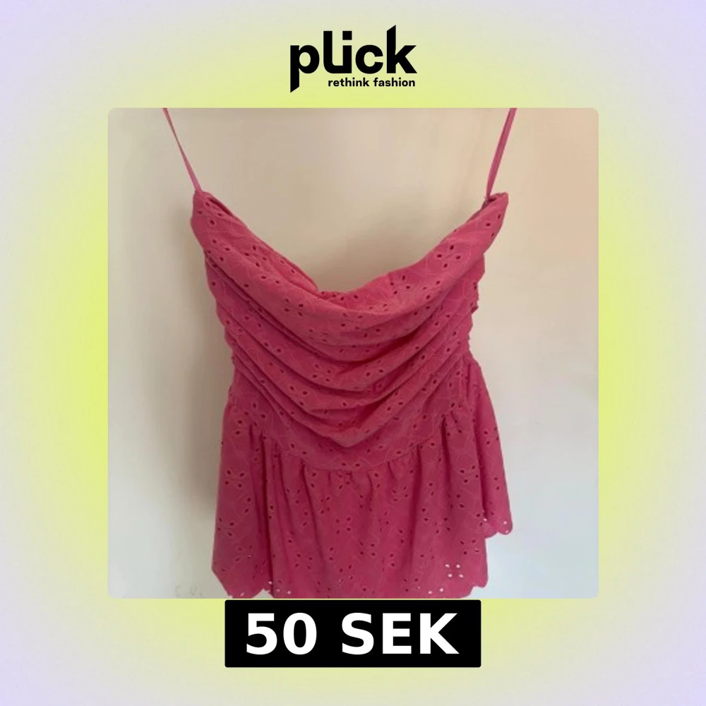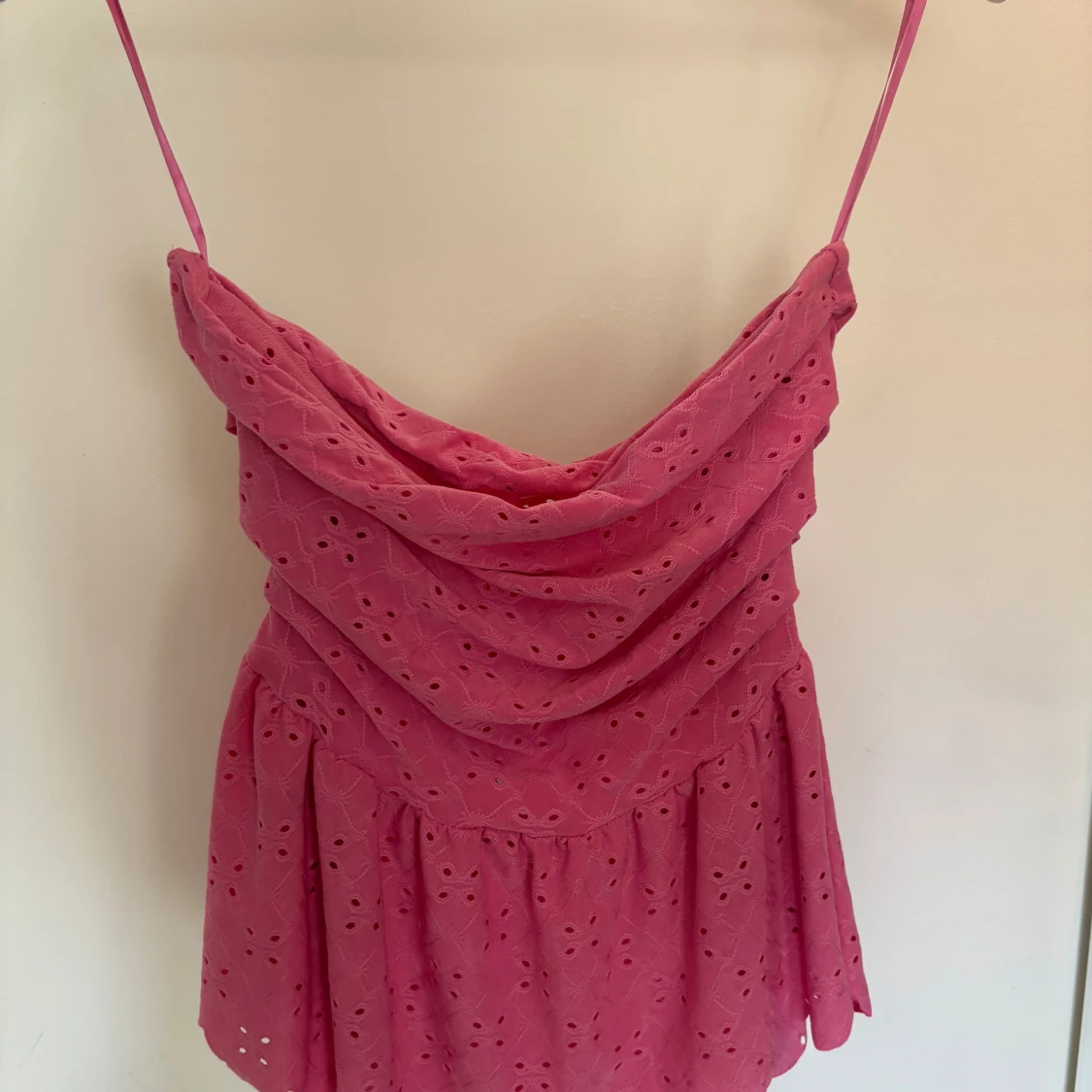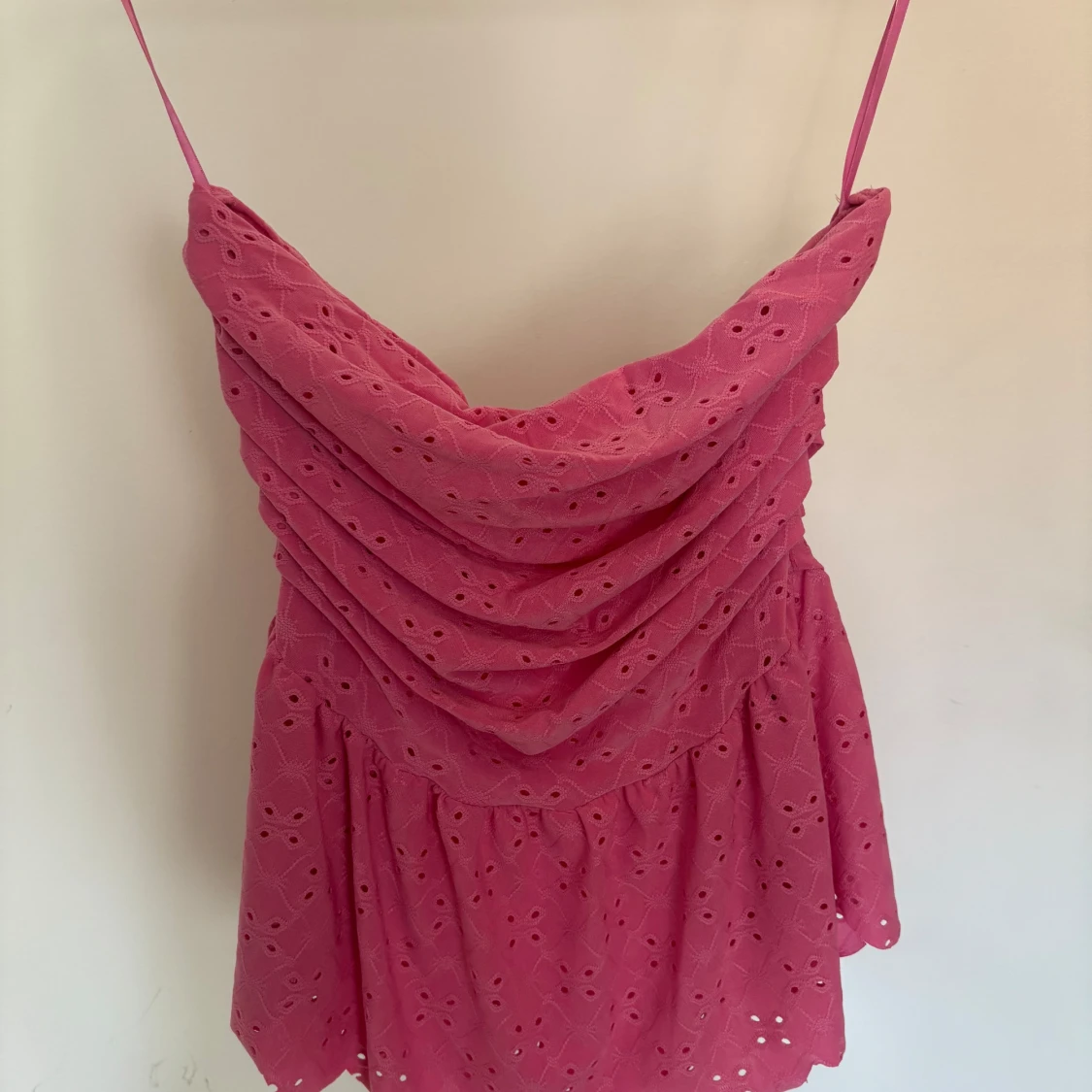 Söt rosa offshoulder sommartopp. Toppen har broderade blommönster och en luftig, lätt volang nertill. Perfekt för varma dagar och somriga tillfällen.
