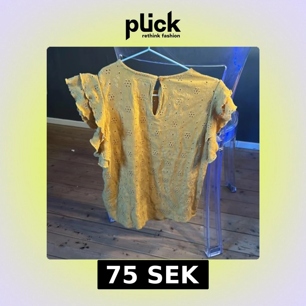 Söt mörk gul blus från Real Superdry vintage, med broderade blommor och volangdetaljer längs ärmarna. Blusen har korta ärmar och knapp i nacken. Perfekt för vår och sommar!