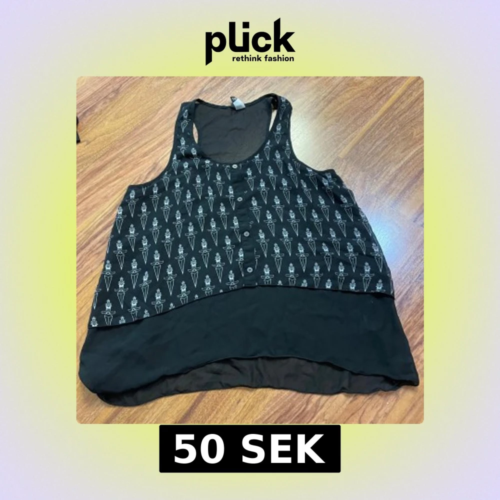 Svart linnetopp från Divided med coolt vitt grafiskt mönster framtill och knappar längs bröstet. Toppen är ärmlös och har en längre, rundad nederkant i tunt, flowy material. Perfekt för dig som gillar edgy och unik stil.
