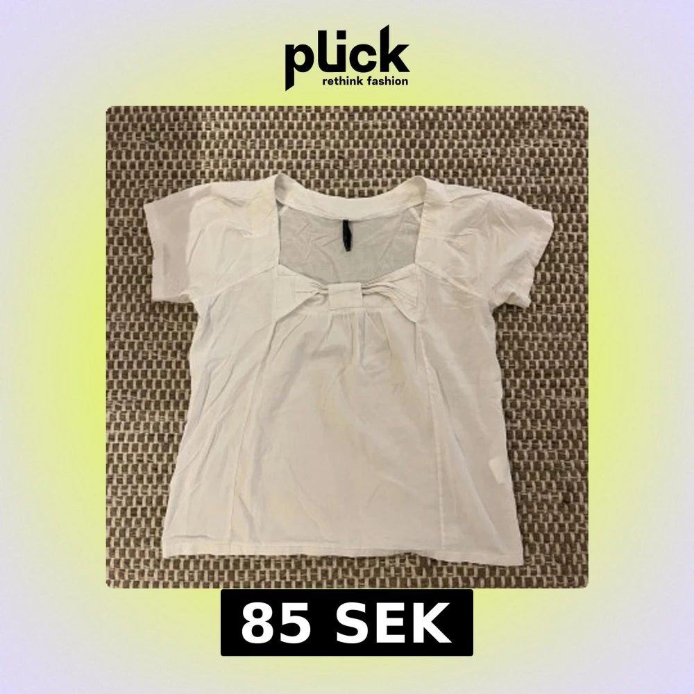 Supersöt vit blus från märket Naf Naf med korta ärmar och en stor rosett framtill. Blusen har en fyrkantig ringning och är gjord i ett tunt, luftigt material som känns perfekt för varmare dagar. Den fladdrar fint och vintage från 2000-talet men tyvärr finns ett litet hål på höger axel. Skriv gärna om ni har några frågor!!