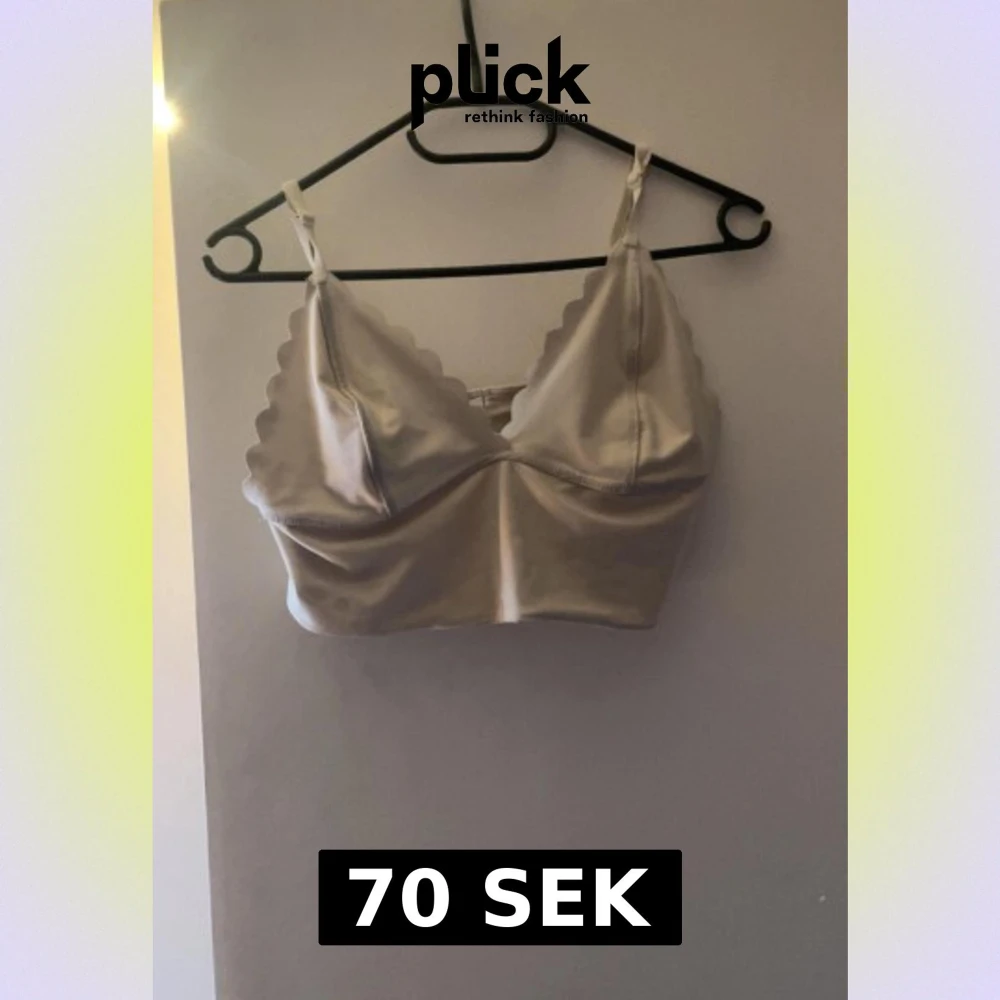 Champagnefärgad bandeau topp i satin med smala axelband och vågiga kanter. Snygg och stilren design som ger en lyxig känsla. Perfekt att styla med höga jeans eller kjol för en trendig look.