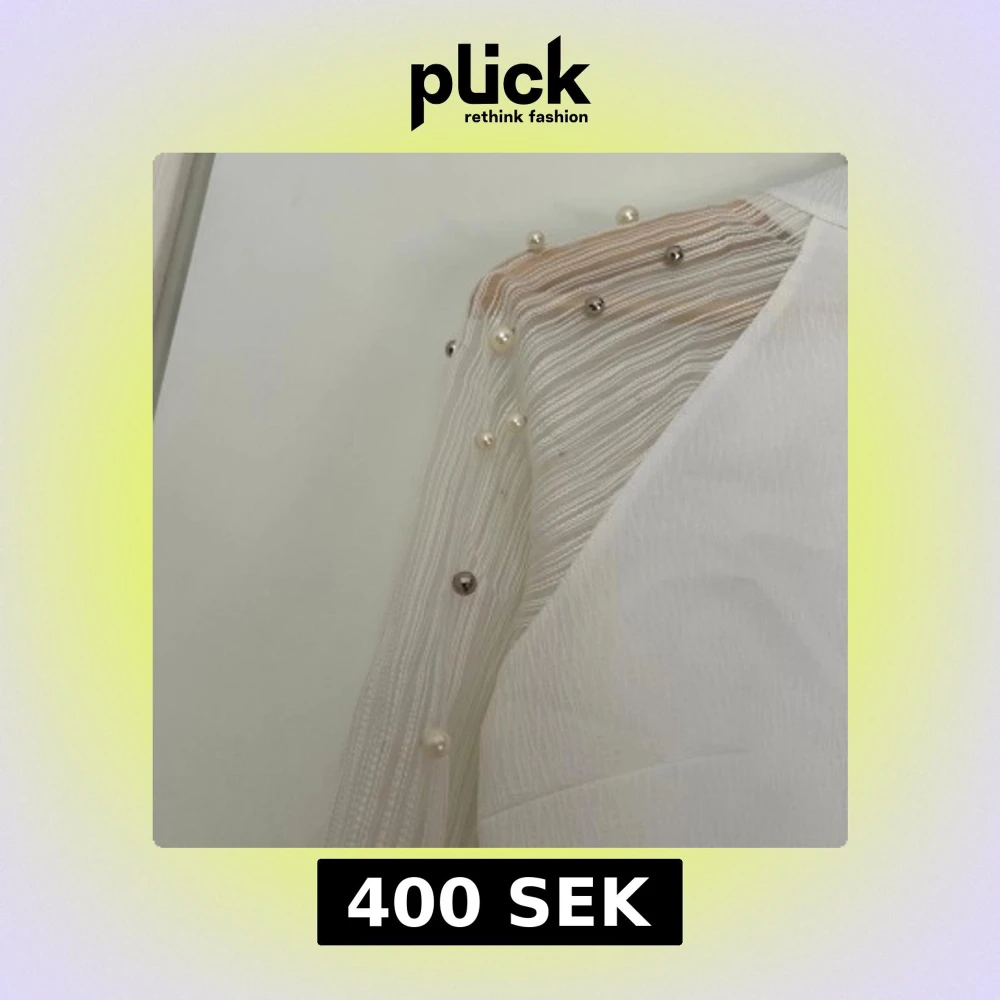 Säljer en vit blus med transparenta, långärmade ärmar i mesh med tunna ränder och pärlor i olika storlekar längs axlar och ärmar. Blusen har hög hals och en stilren, modern look som sticker ut med sina unika detaljer.