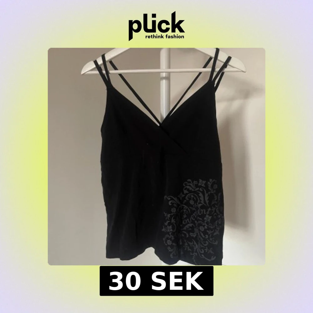 Snyggt svart omlottlinne med smala axelband och ett diskret mönster på sidan. Perfekt till träning eller till vardags. Väldigt skönt material. Köpt på H&M för väldigt länge sedan. Från H&M athletic.