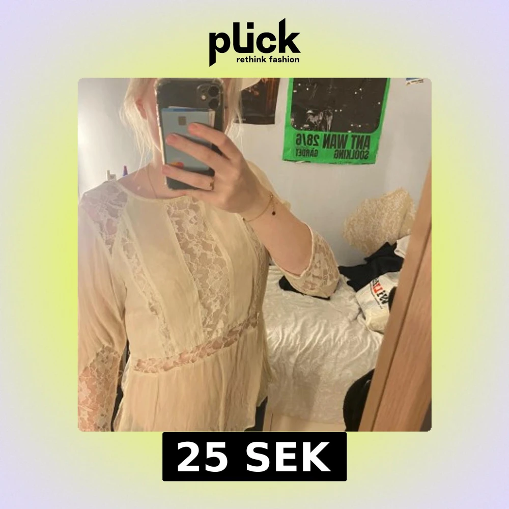 Säljer en romantisk beige blus från H&M Divided i storlek 40. Blusen har genomskinliga spetsdetaljer på ärmar, framstycke och midja, samt en liten knappöppning i nacken. Materialet är lätt och flowy, perfekt för dig som gillar en feminin vibe.