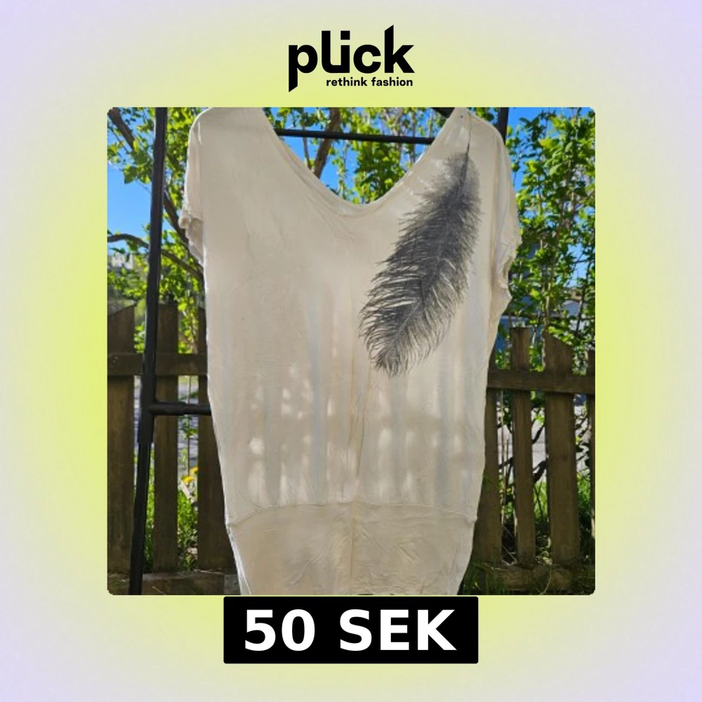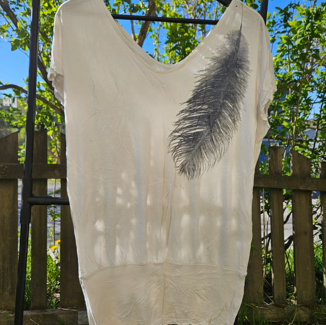 Vit t-shirt med djup v-ringning och ett stort svart fjädertryck på framsidan. T-shirten har korta ärmar och är tillverkad i ett mjukt material som känns skönt mot huden. Perfekt för en avslappnad stil.