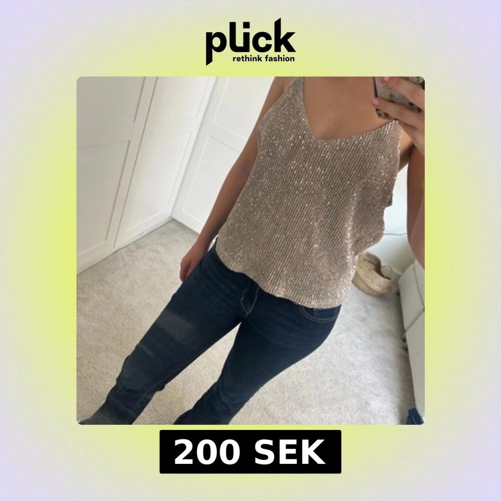 Säljer en glittrig linne-topp i silver med smala axelband och v-ringning. Toppen har en lös passform och är perfekt för att sticka ut. Materialet är syntet och toppen har ett snyggt fall både fram och bak.