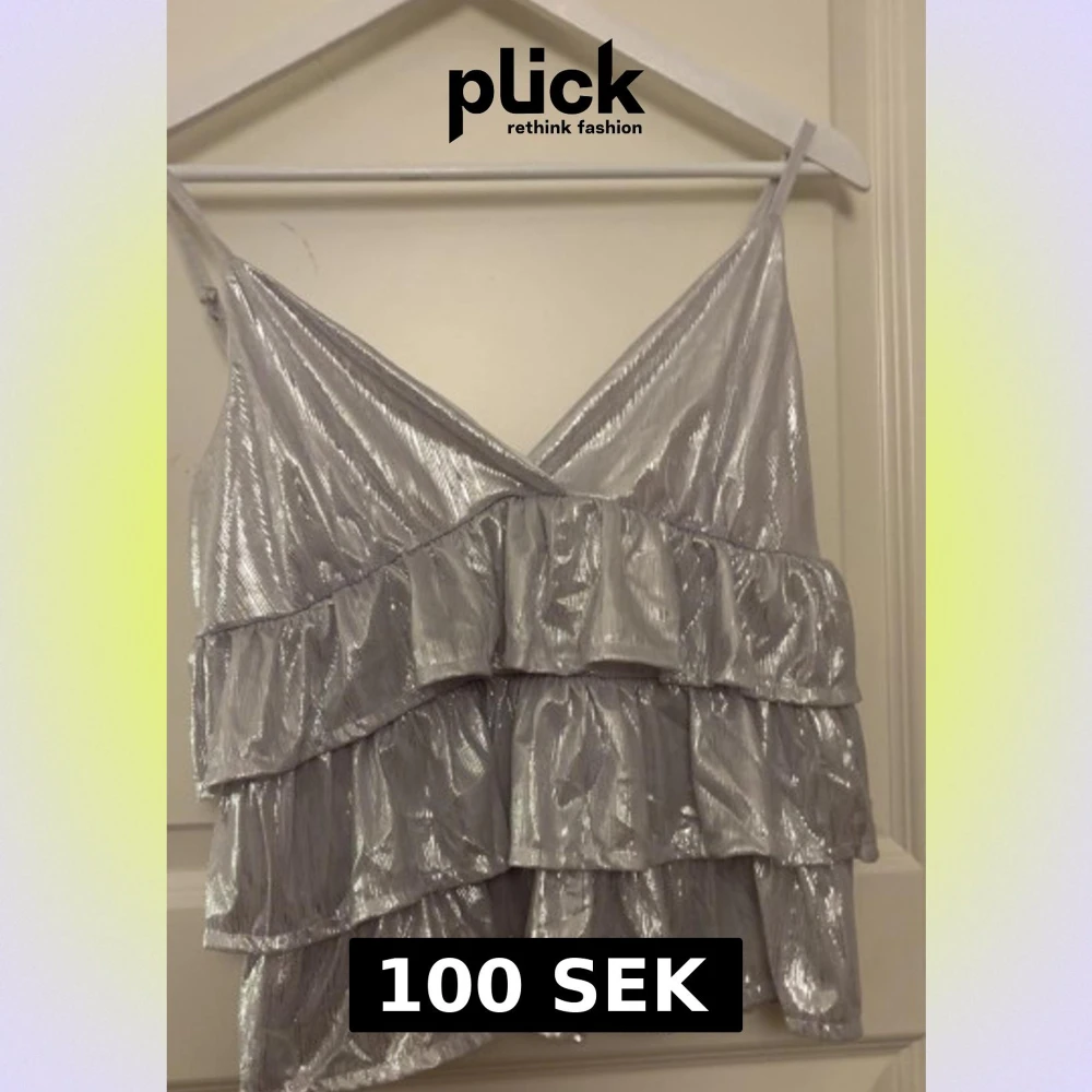 Säljer en glittrig silverfärgad linnetopp med flera lager volanger och smala axelband. Toppen har en snygg omlott-v-ringning och är croppad i modellen. Aldrig använd pågrund av att jag har lite större bröst o fick inte på mig tröjan men perfekt om du har kanske A-C kupa