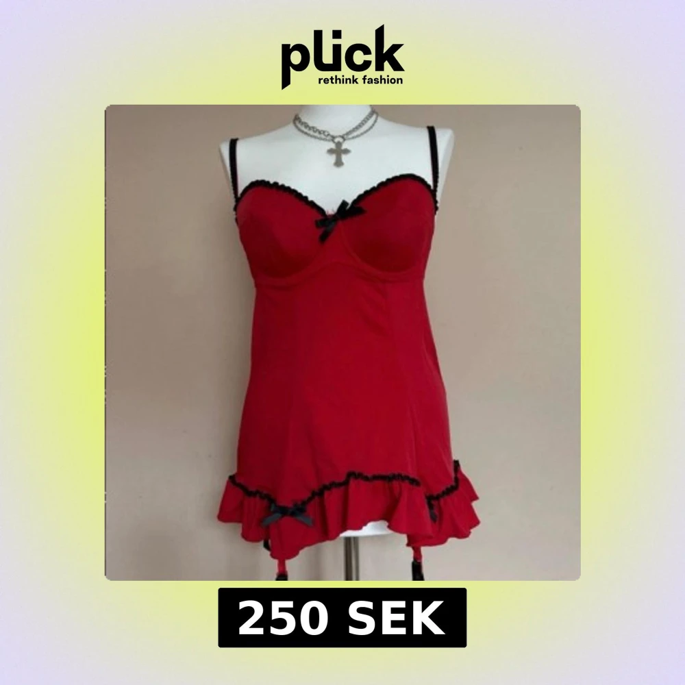 Supersöt röd korsettopp med svarta spetsdetaljer och små rosetter framtill och nertill. Toppen har volangkant längst ner och tunna axelband. Super bra för sommaren❤️